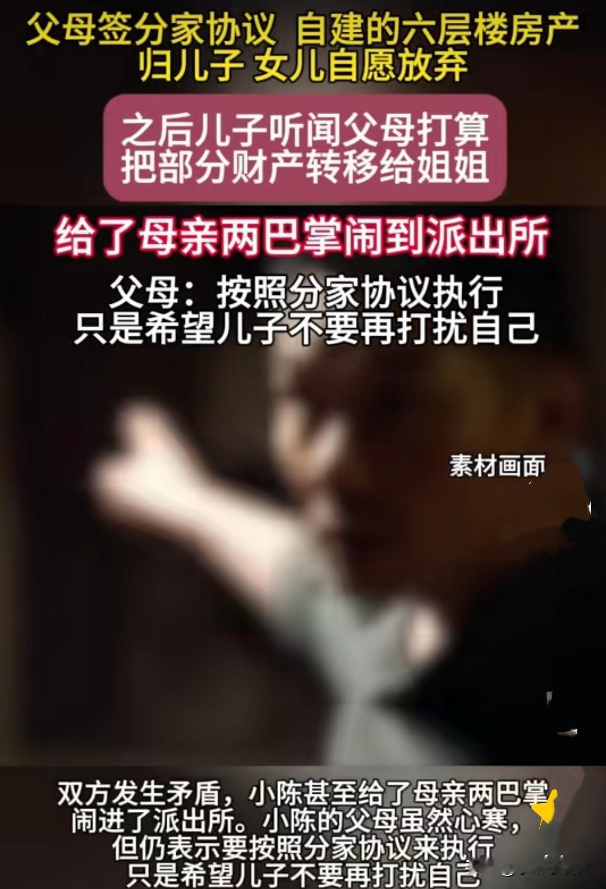 养儿真能防老吗?!”浙江金华,一对老夫妇用一生积蓄建了6层楼房,他们观念传统,觉得儿子可传宗接代,虽女儿照顾他们最多,还是写了协议将楼房全给儿子,女儿不争不怨,自愿放弃。谁知儿子听到传言,说父母打算将部分财产转移给姐姐,认为父母的一切都是他的,姐姐不该拿一分一文。他与母亲发生争执,竟上去扇了她2耳光。父母虽寒心,但还按分家协议将房子给儿子,只希望他不再打扰父母!网友:感觉演给女儿看的,下一步让女儿养老! 老陈夫妻一辈子辛勤操劳,最大的成果就是在家乡盖起了一栋6层的自建房,这是他们穷尽半生心血换来的家产。 受传统重男轻女观念影响,老两口始终认为,儿子才是家里传宗接代的人,所有家产理应全部留给儿子,女儿终究是嫁出去的外人,不该分走分毫。 2025年,老两口与儿子小陈签订了分家协议,家中的姐姐也通情达理,自动放弃楼房的继承权,没表现出一丝不满和怨言。 白纸黑字的协议摆在眼前,6层自建房毫无争议地归小陈所有。 拿到协议的那一刻,小陈满心欢喜,觉得自己牢牢攥住了家里最值钱的资产,未来的生活有了坚实的保障。 按理说,父母将全部家底都赠与他,小陈本该心怀感恩,尽心孝敬二老,让操劳一生的父母安享晚年。 可人心不足蛇吞象,小陈的贪婪就像一个永远填不满的无底洞,坐拥整栋楼房后,他依旧惦记着父母手中剩余的积蓄,丝毫没有满足之感。 没过多久,小陈从旁人那里听到了不实传言,称父母打算将剩余财产转移给姐姐。 这本是毫无根据的闲话,却瞬间点燃了小陈心中的妒火与怒火。在他偏执的认知里,父母的一切财产都该归自己所有,姐姐连一分一毫都不该沾染,父母即便已经把楼房给了他,再补贴姐姐就是偏心不公。 被贪婪彻底冲昏头脑的小陈,怒气冲冲地冲回家中,没任何询问与求证,一见到母亲便大声呵斥。 母亲还没反应过来发生了什么,小陈便扬手狠狠扇了母亲两个耳光。 母亲被打的踉跄地差点栽倒,脸颊迅速红肿,耳边嗡嗡作响。 她僵在原地,眼神里满是震惊与绝望,怎么也不敢相信,自己含辛茹苦养大的儿子,会为了莫须有的财产对自己下此狠手。 这两记耳光,不仅打疼了母亲的脸,更击碎了她的心。 几十年的悉心养育、掏心掏肺的付出,换来的却是亲生儿子的暴力相向,无尽的寒心与委屈将她彻底淹没。 可即便如此,小陈依旧不依不饶,对着母亲破口大骂,指责父母偏心,完全没有意识到自己的行为有多忤逆不孝。 一旁的父亲目睹了这一切,心中又气又痛,气得报了警。 在民警的调解下,老两口虽心寒,却始终没有抛弃重男轻女的老观念。 在老两口的认知里,儿子继承家产是天经地义的传统,即便儿子犯下殴打母亲的大错,他们也依旧选择偏袒。 就这样,即便被儿子狠狠伤害,老两口依旧没有改变决定,6层楼房按分家协议仍全部归小陈所有,希望以后儿子不再打扰父母。 他们以为用房产能换来安稳,却不知无底线的纵容与偏袒,只会养出喂不饱的白眼狼。 这件事传开后,网友和邻居们都愤怒不已。 众人纷纷斥责小陈贪婪自私、忤逆不孝,为了财产对母亲动手,枉为人子。 更多人则痛惜老两口太过糊涂,儿子如此不孝却依旧倾其所有,这不是疼爱,而是助纣为虐。 这场闹剧让“养儿防老”四个字变得无比讽刺。根深蒂固的重男轻女思想,惯出了自私冷漠的儿子,也让老两口的晚年埋下了巨大的隐患。 有人说,两个耳光太轻。太少,没打醒! 乖巧懂事的女儿分文未得,忤逆不孝的儿子却坐拥全部房产,这样的结局实在让人意难平。 正所谓可怜之人必有可恨之处,老两口一味的妥协与偏袒,最终换来的大概率不是安享晚年,而是更深的伤害。 还有人说,好计谋,挨了巴掌成功的把养老甩锅给女儿。家产还是儿子的! 小陈被欲望吞噬良知,即便得到了房产,也早已失去了最珍贵的亲情。 父母的溺爱与偏心从不是爱,而是毁掉孩子与自身幸福的毒药,真正的养老依靠,从来不是靠家产堆砌,而是以真心换真心。 对这对老人的做法您怎么看?
