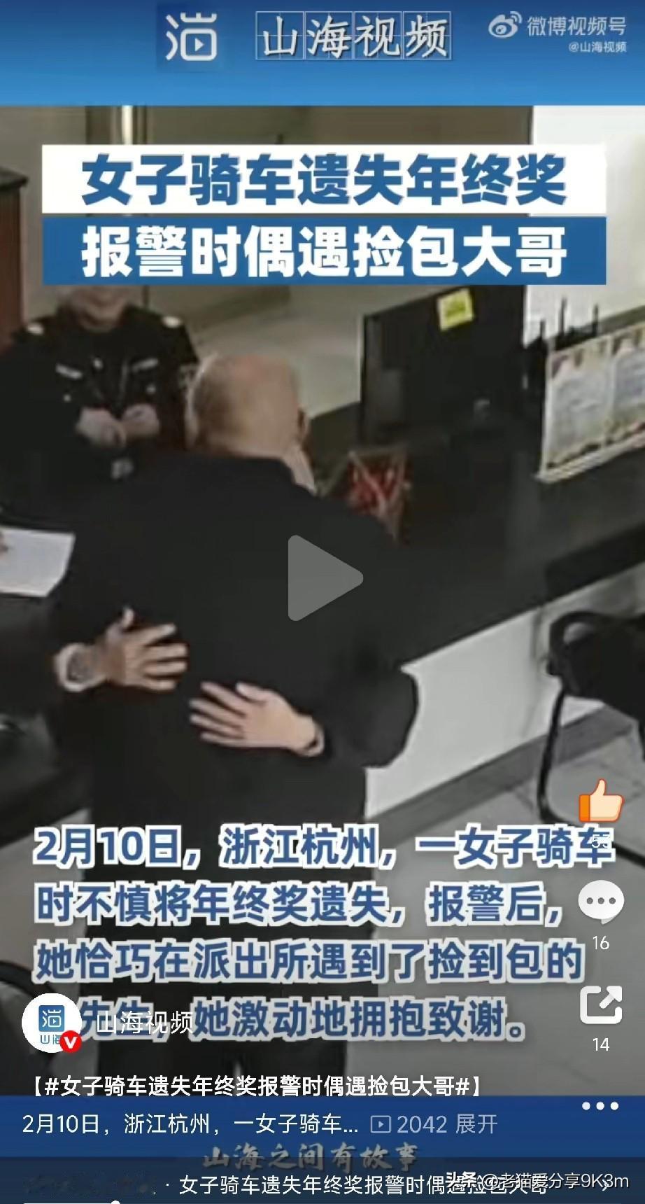 2月10日,浙江杭州发生了一件暖心事!一女子骑车时不小心把包弄丢了,里面装着刚领的年终奖,整整2000块啊!更关键的是,这钱还是给孩子准备的学费! 女子急得不行,赶紧去派出所报警,眼泪在眼眶里直打转,心里估计凉透了... 没想到! 就在她在派出所报案的时候,戏剧性的一幕出现了——捡到包的好心人朱先生居然直接送包来了! 原来,朱先生在路上捡到包后,一看里面有现金、手机、钥匙,急人之所急,赶紧忙完手头事就送到派出所。一进派出所门,正好撞上失主!女子瞬间激动得哭了,直接冲上去抱住朱先生,连声说谢谢! 朱先生可实在了,摆摆手说:“没事没事,就是举手之劳!大过年的,大家都平平安安、开开心心的就好!” 这话说得太敞亮了!必须点个大大的赞! 网友评论: “好人一生平安!这大哥真是活雷锋啊!” “太感动了!年终奖失而复得,这得是多大的惊喜啊!” “为杭州的暖心大哥打call! 社会需要这样的正能量!” 这就是现实版的“好人有好报”啊!愿这样的善意永远传递下去~ 也提醒大家:骑车时一定保管好随身物品,别让粗心坏了大事! (文章素材来自山海视频,侵删)