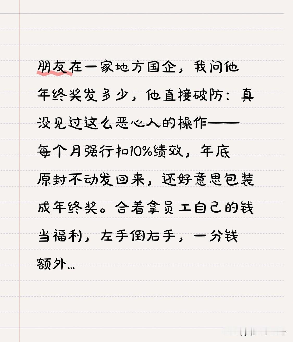 朋友在一家地方国企,我问他年终奖发多少,他直接破防: 真没见过这么恶心人的操作——每个月强行扣10%绩效,年底原封不动发回来,还好意思包装成年终奖。 合着拿员工自己的钱当福利,左手倒右手,一分钱额外奖励没有,还搞得跟公司多大方似的。 吃相难看,套路玩得贼溜,堪称职场奇葩天花板。年终奖