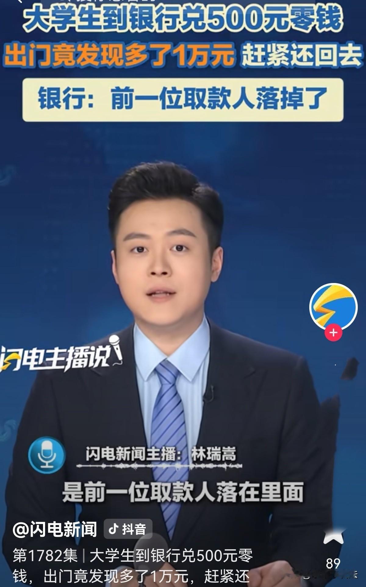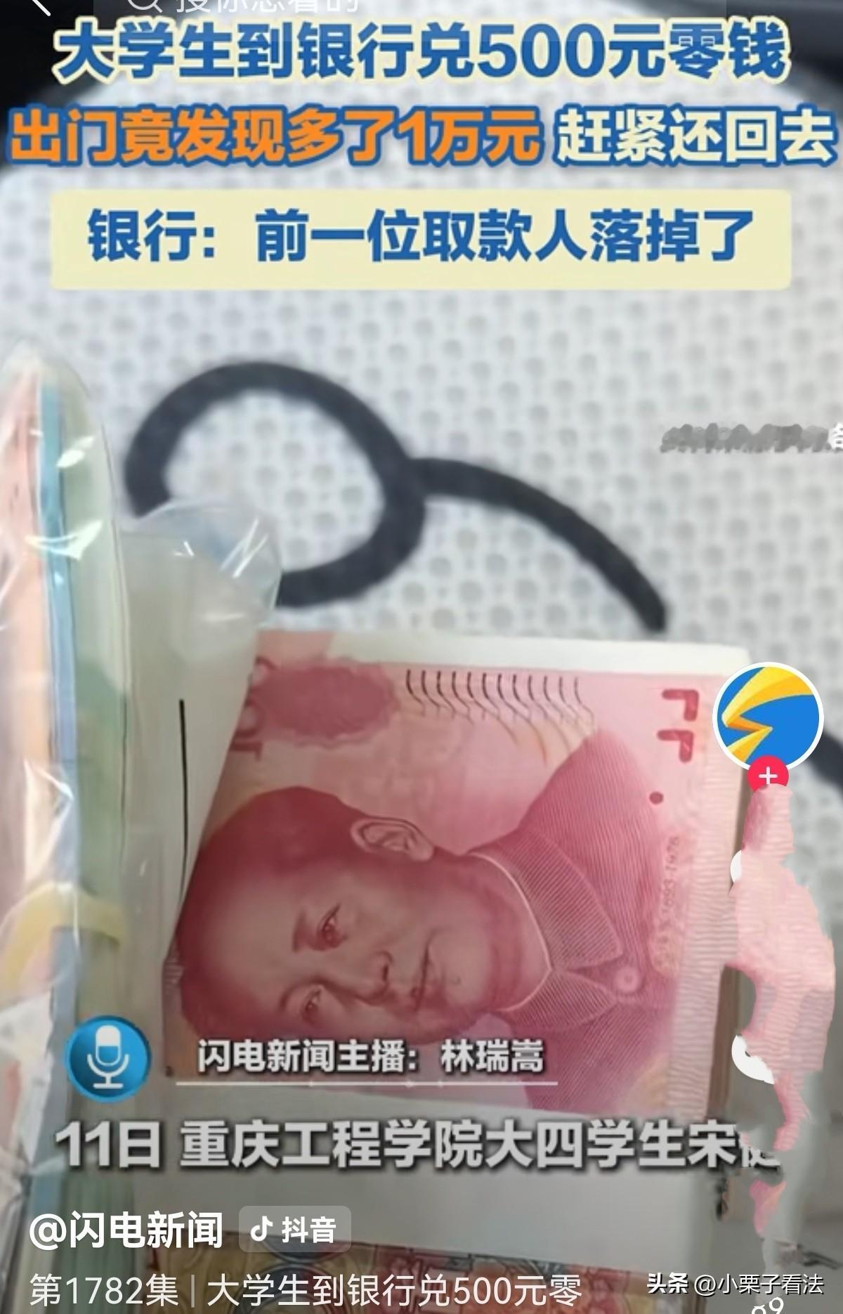 重庆,一大学生在创业,拿500元去银行换散钱,柜员为他兑换完零钱后,装进一袋子卷成一团,放进柜台槽里,大学生直接一把抓走了。回到车上发现袋子里多了一沓1万元百元钞。男子觉得不是自己的钱一分都不能留!他怀疑是前面顾客掉下的,万一是救命钱?丢的人肯定很着急!于是,他反身回去将钱还给了银行。这本是拾金不昧的好事,却遭到网友各种质疑和谩骂,他很无语! 重庆工程学院的大四学生宋健,边上学边创业,是个很有上进心的小伙子。 在2月11日下午,带着500元钱,来到银行,想换成零钱周转。 本来是再平常不过的一笔小业务,谁也没想到,接下来发生的事,让他用一个朴素的举动,暖了很多人的心。 银行柜台办理得很快,柜员把装好零钱的袋子卷成一团,放进柜台的传递槽里。 宋健想着就500块零钱,也没必要一张张清点,伸手一把就把钱袋抓了过来,随手塞进兜里,转身就走出了银行。 上车坐定后,他习惯性地摸出袋子想整理一下,这一摸,整个人都愣了,零钱袋外面,竟然还裹着一沓整整齐齐的现金,捆得规规矩矩,一看就不是自己要换的零钱。 他心里咯噔一下,第一反应是懵了。 长这么大,从没遇到过这种天上掉钱的事,10000元百元钞,这可不是小数目! 他快速数了一遍,不多不少,正好一万元。心跳一下子快了起来,脑子里乱糟糟的:这钱哪来的?是银行多给了,还是别人落下的? 他稳了稳神,很快想明白,大概率是自己前面那位办业务的客户,取钱时没拿干净,落在槽里,被柜员连同自己的零钱一起递了出来。 说实话,面对突然多出来的10000元,谁心里都会晃一下。 宋健也不例外,那一瞬间,他也有点不知所措,甚至有点慌。 但他没多想,更没动一点私心。他当时就琢磨,这钱肯定不是自己的,万一这是人家的救命钱、生活费、周转款,丢钱的人得多着急啊。 要是自己揣着走了,晚上都睡不踏实。再说,真要是被找上门,有理也说不清,丢人的是自己,良心上更过不去。 因为是第一次碰到这种事,他心里又紧张又忐忑,怕事后说不清楚,干脆拿出手机,把整个还钱的过程录了下来。 一方面是给自己留个证明,免得后续有误会;另一方面也想着,万一失主能刷到视频,也能放心去银行认领。 录完视频,他没有丝毫犹豫,立刻掉头赶回银行柜台,把那一万元现金原封不动地交还给工作人员。 他说,不是自己的钱,一分也不能留! 面对突然折返还钱的宋健,银行柜员一开始也有点意外,听完他的说明,赶紧核对账目和监控。 很快真相就水落石出:这一万块,正是宋健前面那位取款人落下的。那位客户办业务时有点恍惚,取完钱没拿干净,剩下的一万元就留在了传递槽里,后续被一并交给了宋健。 银行第一时间联系上了失主,当天下午,失主就赶到银行,领回了这笔失而复得的钱。 事情传到网上后,很快引发了大家的讨论。 有人说,本来是心中一阵窃喜,回头一想,等人找上门来丢人就丢大发了,不如现在还回去还能落个好名声! 有人说,这是拿走想昧下了,又发现银行全方位覆盖摄影头,才不得不还。500元和10000元区别太大了,他不可能感觉不出来! 还有人说,你还算聪明,要是不拿回去的话,就会说你拿的是两万、三万……说不清啊! 《民法典》第985条规定:得利人没有法律根据取得不当利益,受损失的人可以请求得利人返还取得的利益。 但在宋健这里,没有那么多弯弯绕绕。他就是一个正在创业、忙着打拼的普通大学生,面对意外之财,守住了最朴素的底线:不是自己的钱,一分都不能要。 他没有想过要表扬,也没有想过要回报,只是做了自己觉得该做的事。他的行为不仅是道德选择,更是履行法定义务,值得肯定。 10000元,可能是一个家庭的急用款,可能是一个人辛苦攒下的积蓄,也可能是一笔关乎生计的周转金。 宋健的一个转身、一次归还,守住的不只是别人的钱财,更是当代年轻人的诚信与担当。 这件小事不大,却足够温暖,也让我们看到,最珍贵的从来不是意外之财,而是那颗不贪不占、坦坦荡荡的心! 所以不要在意别人的质疑和谩骂,你只管做善良真诚的自己就好! 对这件事您怎么看?