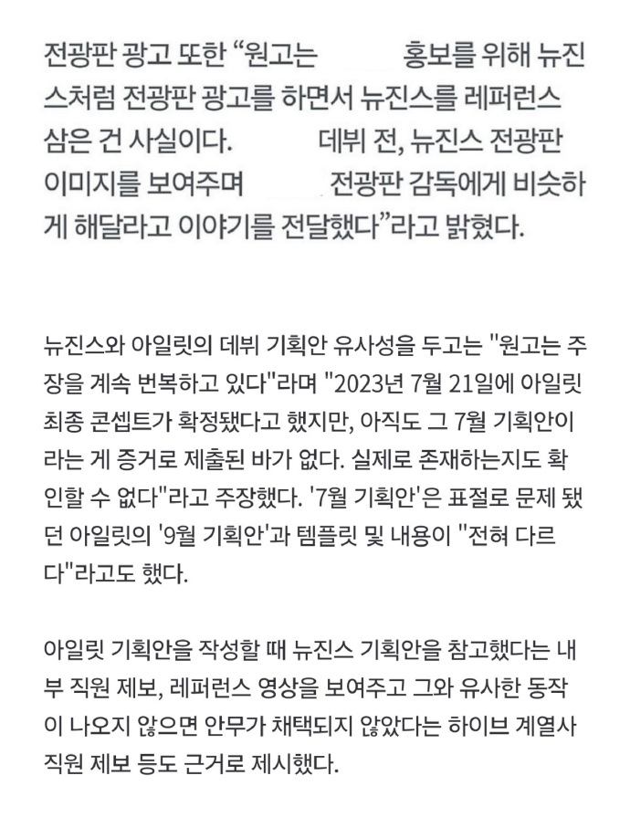 韩法院认定ILLIT抄袭NewJeans的证据 证据如下↓1. BELIFT LAB希望将 ILLIT 的电子大屏广告做得与 NewJeans 的广告图相似(两者均为出道宣传期)2. 内部告发录音:曾将 NewJeans 策划案共享给 BELIFT LAB 的员工提到,没想到他们会(把 ILLIT 的策划案)做得一模一样3. 给编舞看参考视频,若不出现类似的动作,该编舞则不会被采纳