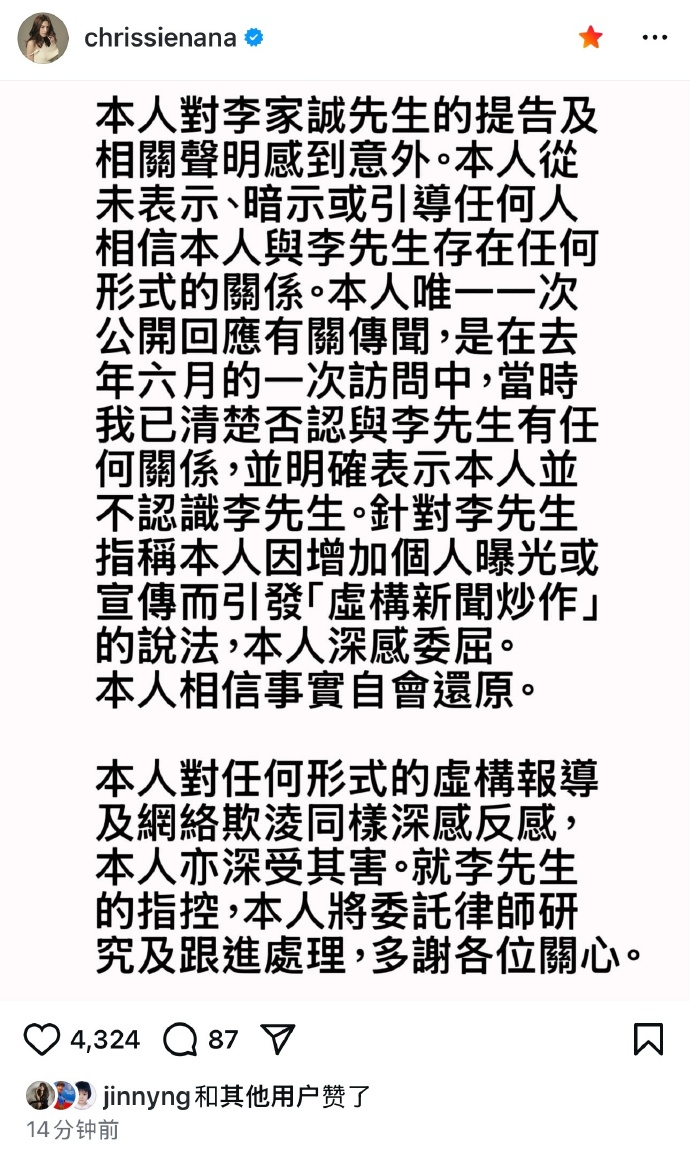 周秀娜回应被李家诚提告 本人对李家诚先生的提告及相关声明感到意外。本人从未表示、暗示或引导任何人相信本人与李先生存在任何关系。针对李先生指称本人因增加个人曝光或宣传引发「虚构新闻炒作」的说法,本人深感委屈。本人相信事实自会还原。