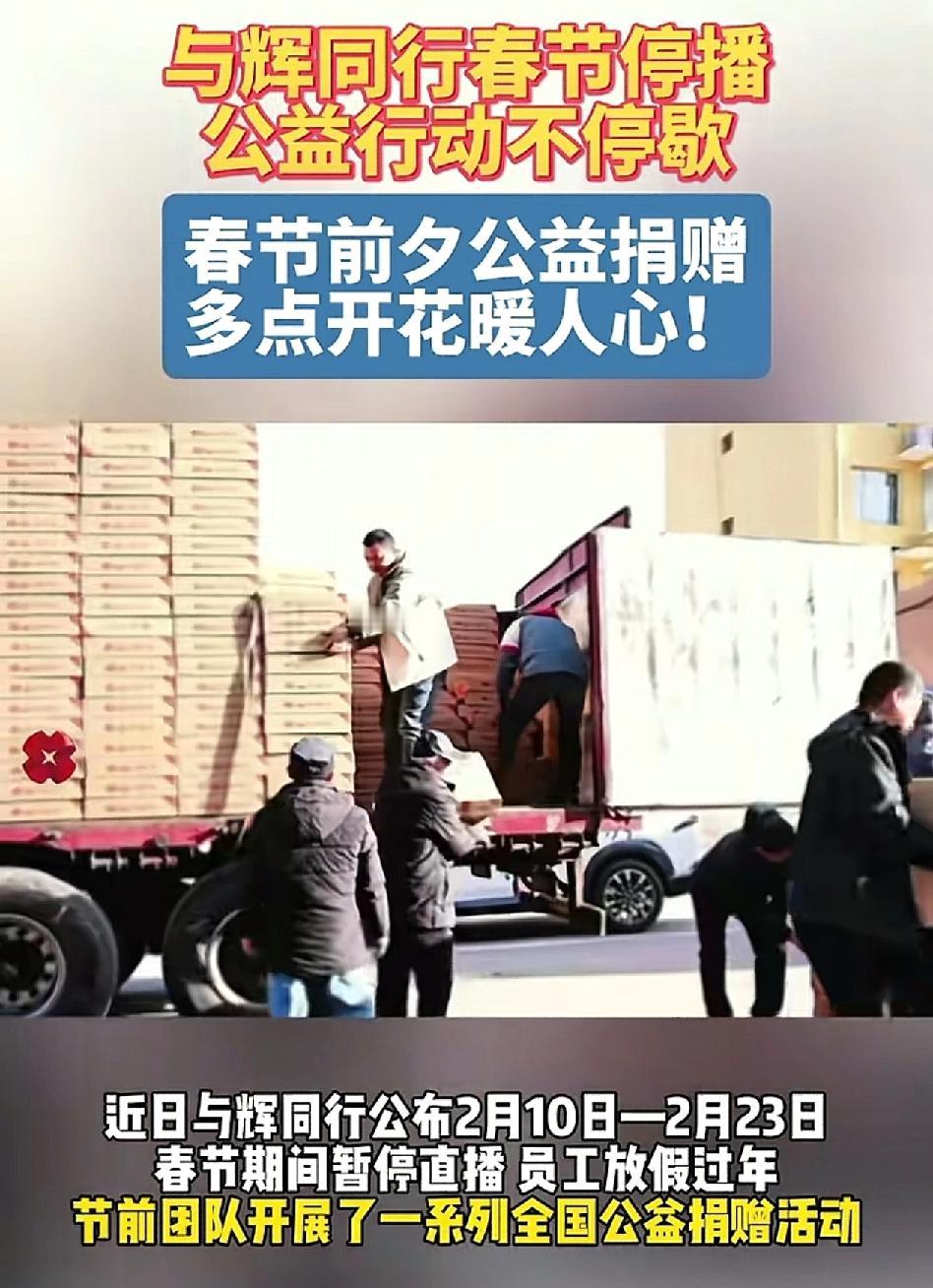 与辉同行加速了公益事业的进程,董宇辉把公益做成了另一个主业。 马年春节前夕,与辉同行直播间早已放假停播,然而他们的部分员工还在各地推行董宇辉的公益计划。 这不是简单的走个过场,而是覆盖了多个地区。山西原隰县的6700脱贫户,西安的环卫工人和福利院,重庆奉节的果农,宁夏盐池的低保户,黑龙江巴彦县,湖北丹江口市困难群众。。 每一批次都有近7000多份新年物资,其中不少都是与辉同行的定制产品。 以往董宇辉做公益从来不高调展示,这一次大张旗鼓地开展,或许也是因为最近的风波导致。李亚鹏为他鸣不平,一个人做好事,为什么不能大大方方的说出来呢?这个问题,行胜于言,董宇辉的公益做得比别人更扎实,更用心。