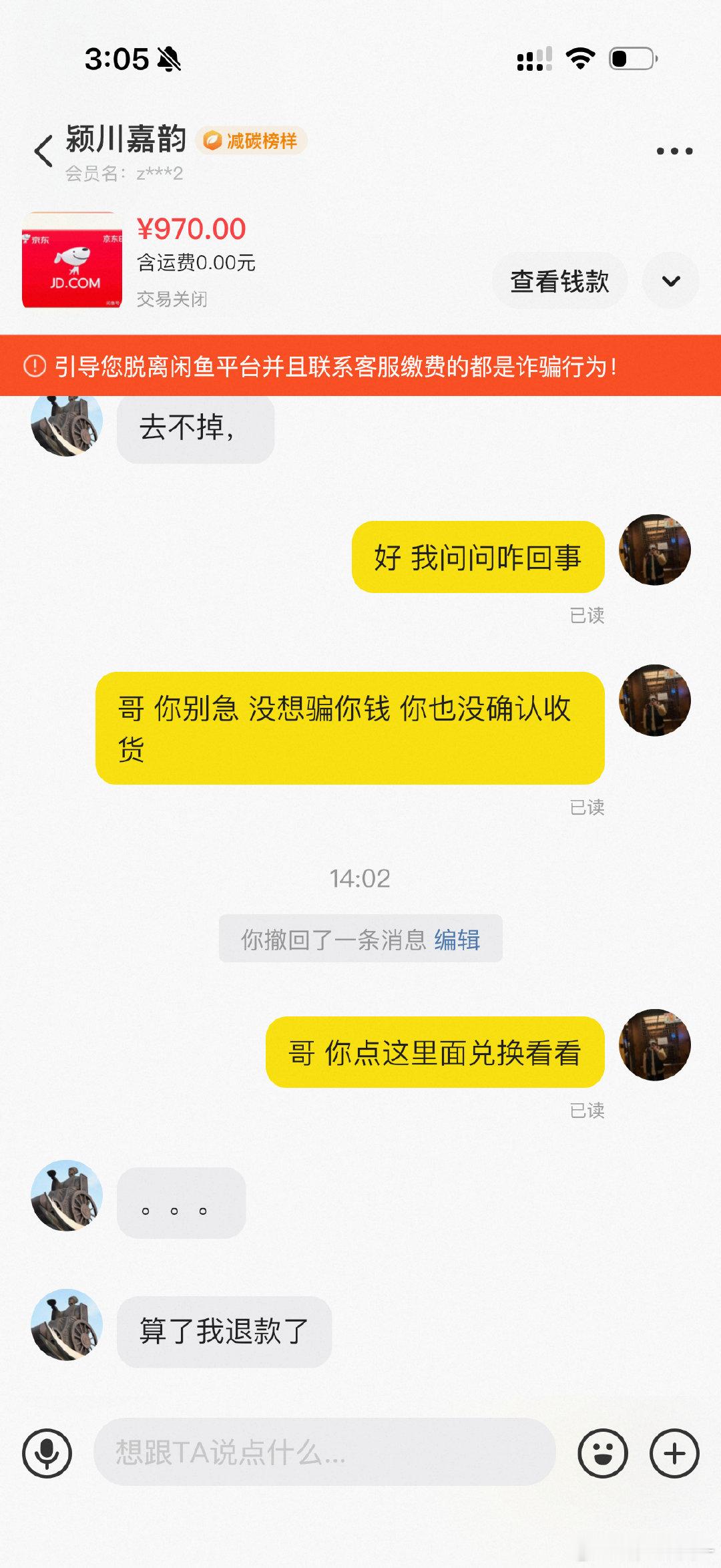 结果后面自己兑换的时候发现兑换不上,查记录发现是对方又偷偷跑去兑换了,关键是我已经同意退款了,现在被骗了600…