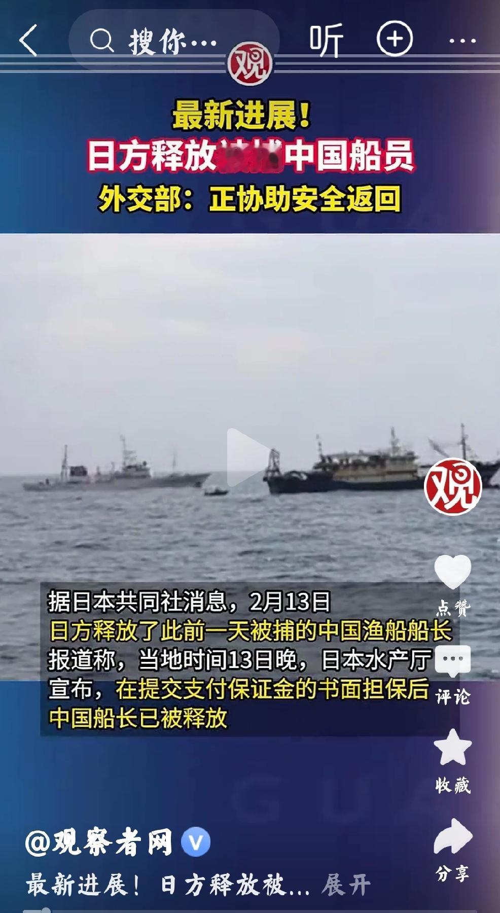 2月13日,日本共同社报道:日方释放了此前一天被捕的中国渔船船长,外交部:正协助安全返回。 个人认为:这是日本蓄意反复试探,中方底线。为何日本要反复试探呢? 日本就是要不停的用这种小动作来骚扰中国,在反复骚扰中,中国一旦放松警惕,那么日本就会毫不犹豫的用尽全力的偷袭中国。 日本不是不敢战,而是要坚定的用尽全力的偷袭中国。 不可轻敌,日本是心腹大患