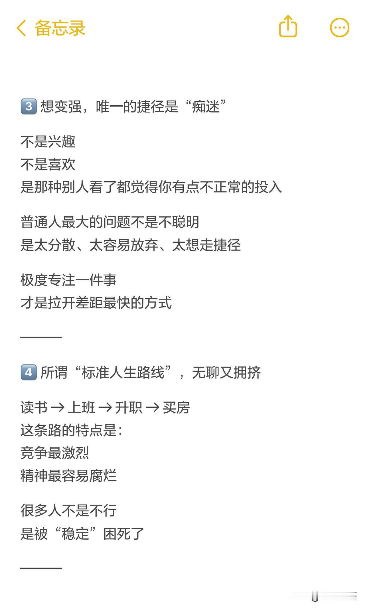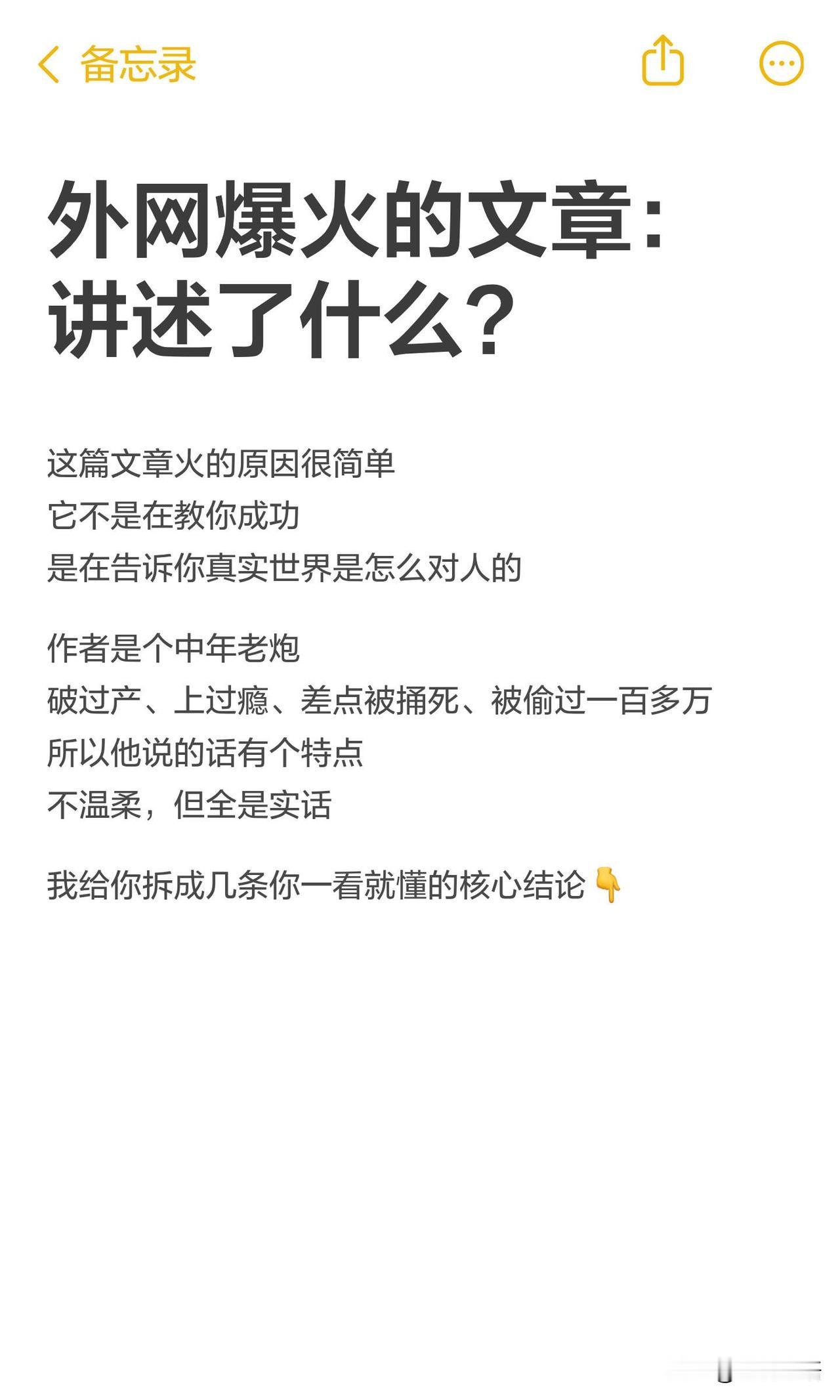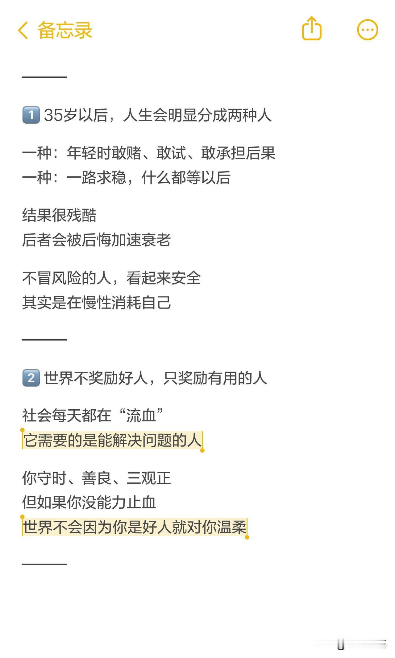 刷到外网爆火的这篇38岁博主的人生感悟,直接被戳中了,全是掏心窝的大实话,没有一点鸡汤味。 作者踩过无数坑,破产、被骗、差点丢命,把35岁后的人生看得透透的。 35岁后真的会明显分成两种人,敢试敢赌的,和一路求稳的。 后者看着安稳,其实是慢性消耗,最后全被后悔缠上,越活越累。 这世界从不是你善良守规矩,就对你温柔。 它只奖励有用的人,能解决问题的人,人品再好没能力,啥用都没有。 普通人想拉开差距,别谈兴趣,要极致痴迷,死磕一件事,这才是唯一的捷径。 别被读书上班买房的标准路线困住,这条路挤破头,还特容易磨掉心气。 钱也别避之不及,它就是工具,看不懂钱的人,只会被钱牵着走,连选择权都没有。 困难从来不是坏事,熬过去的人,心里都长了肌肉,抗造! 忙到脚不沾地也别沾沾自喜,大概率是没重点、没选择权的低级忙。 最戳我的还是那句,你可以不牛,但不能对人生毫无攻击性。 日子过得太舒服太没故事,真的要小心,这不是稳定,是未来的雷。 20、30岁的年纪,别怂,别等,别躺平,折腾点故事出来才不亏!