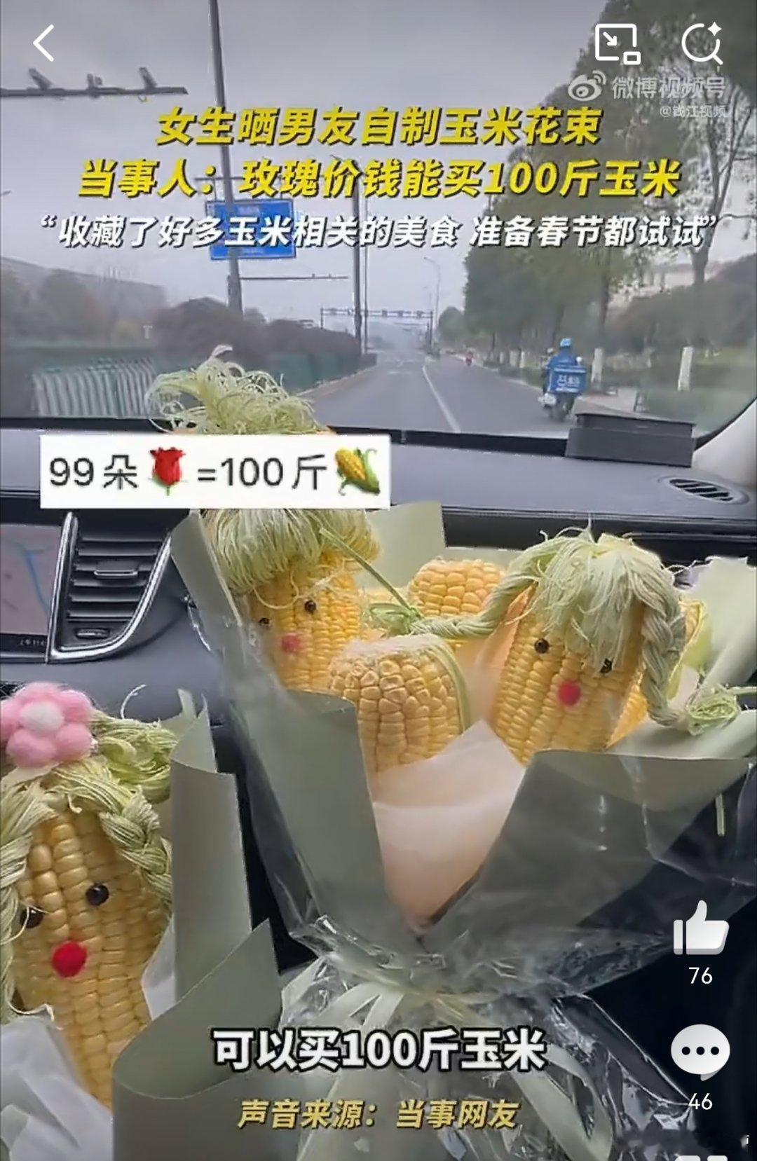 收玉米女生称玫瑰价钱能买100斤玉米女生收到花后先打开的是食谱 你别说还挺可爱的,现在的年轻人确实会玩,也不攀比了,也不内耗了,但是浪漫必须拿捏到位。用玉米代替玫瑰,花店再也别想赚我的钱