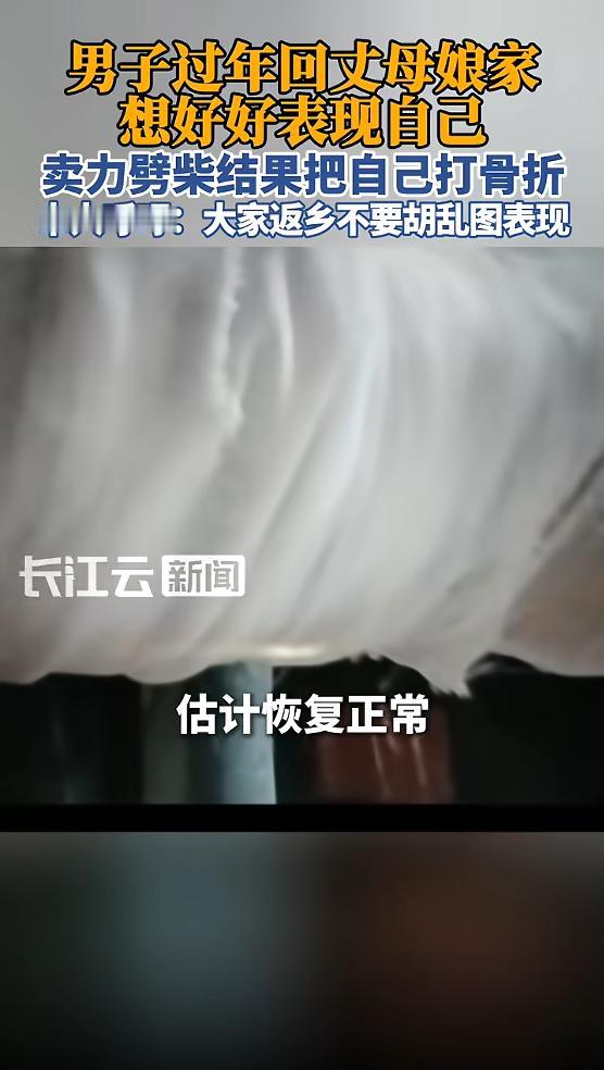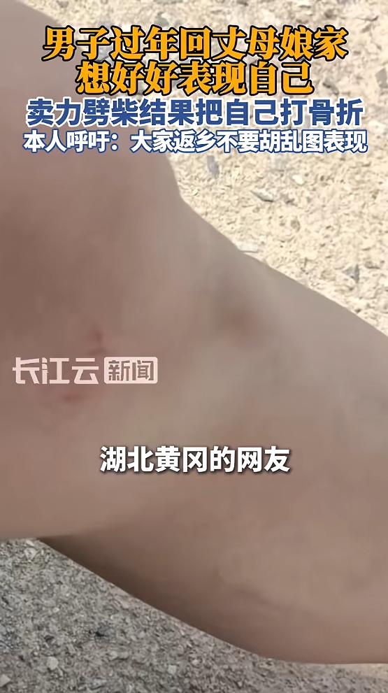 [微风]“这下尴尬了吧!”近日,湖北黄冈,一男子回丈母娘家,见院子里堆着柴火,就想表现一下,没想到因为缺乏经验,斧头打滑,木柴直接反弹,导致他直接骨折,疼得他哇哇直叫,只能去医院打石膏,估计需要数月才能恢复!网友:劲真大! 那是一张特别扎眼的X光片,黑白对比很清楚,左腿胫骨那道裂缝看着就让人心里一紧。 这不是什么运动受伤的纪念,而是今年1月,湖北黄冈一位“城里女婿”春节前留下的真实经历,对他来说,这张片子不只是骨折那么简单,还意味着几百块医药费,几个月打石膏动不了的日子,还有那点被摔碎的面子。 事情得从那个“想表现一下”的下午说起,这位平时坐办公室的女婿,一进岳父家院子,就看到一堆待劈的柴火。 那一瞬间,男人的某种“我要证明自己”的冲动突然就上来了。 按传统,女婿上门带烟酒茶就够体面了。 但在他看来,这些哪有亲自干点体力活更显诚意? 岳父母一再劝,说不用他干。 他不听,斧头一拿,自信满满:“我会,很简单。” 他想证明自己,不仅能赚钱,也能干活,是个全能型家庭成员。 可现实很快给他上了一课,农村干活是有门道的。 老手都知道,劈柴要在泥土地上,地面能缓冲力道,可他脚下,是结结实实的水泥地。 更要命的是,他选的还是没干透的湿木头,这种木头特别有韧性,劈下去像压弹簧一样,会反弹。 结果就出事了,他也不看纹理,就靠蛮力往下劈。 斧头的力量没被地面吸收,也没劈开木头,反而被湿木头整个弹回来。 那根木柴像个反弹炮弹一样,直接砸中他的左腿胫骨。 前一秒还在挥刀展示气势,后一秒就扔斧头抱腿惨叫,冷汗直冒,人站都站不住。 想象中的岳父赞赏没有出现,换成全家慌慌张张扶人,赶紧送医院。 本来想展示能力,结果把春节气氛直接劈没了。 角色一下反过来,他本来是来帮忙的,现在成了被照顾的那个人。 岳父母不仅没享到女婿的福,还得端水送饭照顾伤员,气氛别提多尴尬。 岳父坐旁边抽烟,一句话没说,但这种沉默,比骂一顿还让人难受。 其实,这种事不是个例。 如果把今年春节网上的故事凑一凑,完全可以成立一个“笨拙女婿互助会”。 有人帮老丈人拔花生,忙活半天只拔出苗,花生全留地里,纯纯无效劳动。 有人自信修水管,越修越漏,最后花300块请师傅来收拾。 还有经典案例——假装会骑摩托,带岳父直接冲进沟里。 据说岳父当场酒都醒了,想骂又不好意思,表情能让人记一辈子。 这些事看着好笑,其实背后是代际之间的小尴尬。 年轻人想通过“干点大活”证明自己,弥补平时陪伴少的愧疚。 但他们忽略了一点,农村那些活,是老一辈几十年练出来的本事,不是撸袖子就能学会的。 这次骨折,说白了,就是“面子工程”翻车现场。 不过话说回来,也不是完全没有好的一面,因为受伤,这位女婿只能老老实实躺着休养。 反而难得慢下来,在岳父母家待了很久,以前过年匆匆忙忙,这次却天天坐一起聊天、吃饭、唠家常。 没有表演,没有逞强,就只是陪着。 老人其实要的,从来不是一个不熟练的临时劳力,而是愿意坐下来陪他们说话的家人。 虽然这条腿付出的代价有点大,但换来的,是更真实的相处。 某种意义上,这个春节最重要的收获,不是面子,也不是表现,而是陪伴。