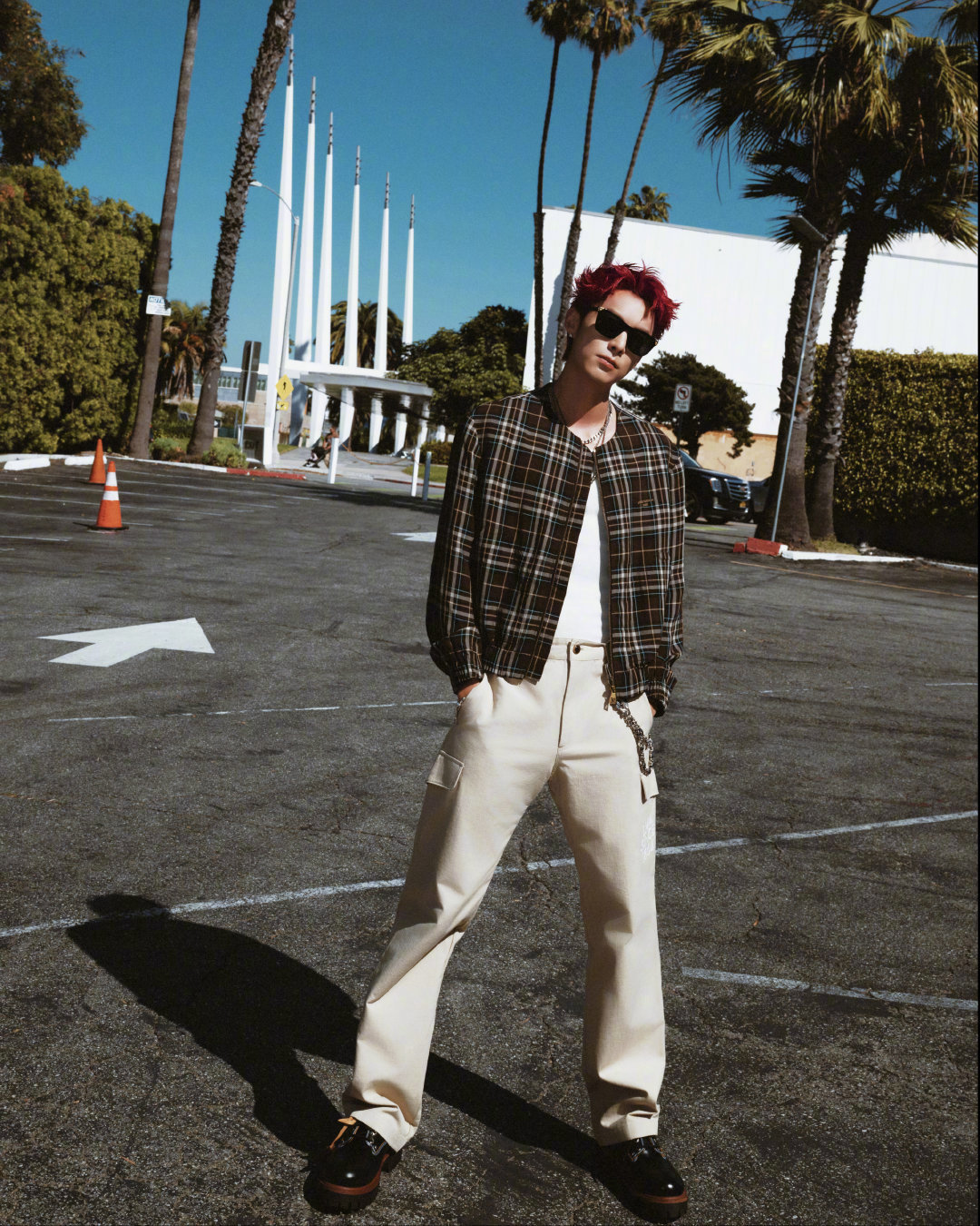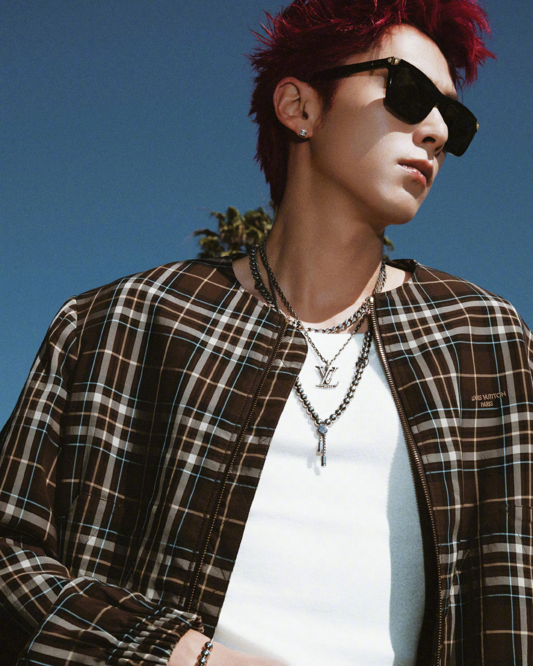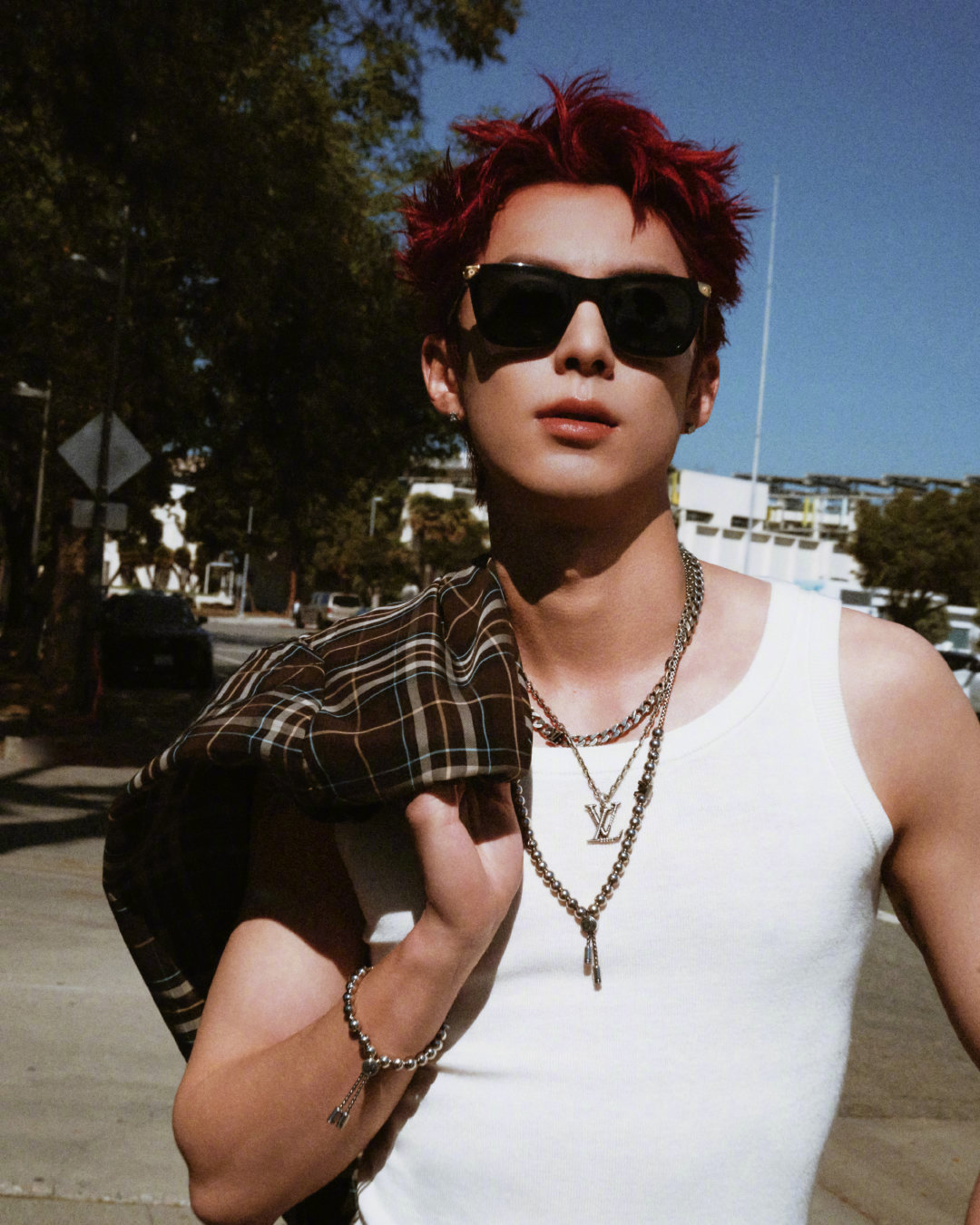 王鹤棣 NBA全明星名人赛·洛城之旅街拍,LV格纹外套内搭白背心,叠戴配饰、红色短发… 简单时髦的痞帅Style~ 🏀🕶️ 王鹤棣第三次出战名人赛