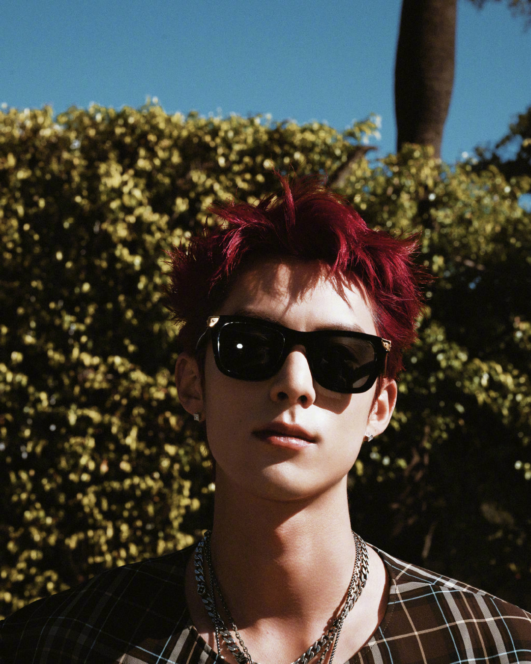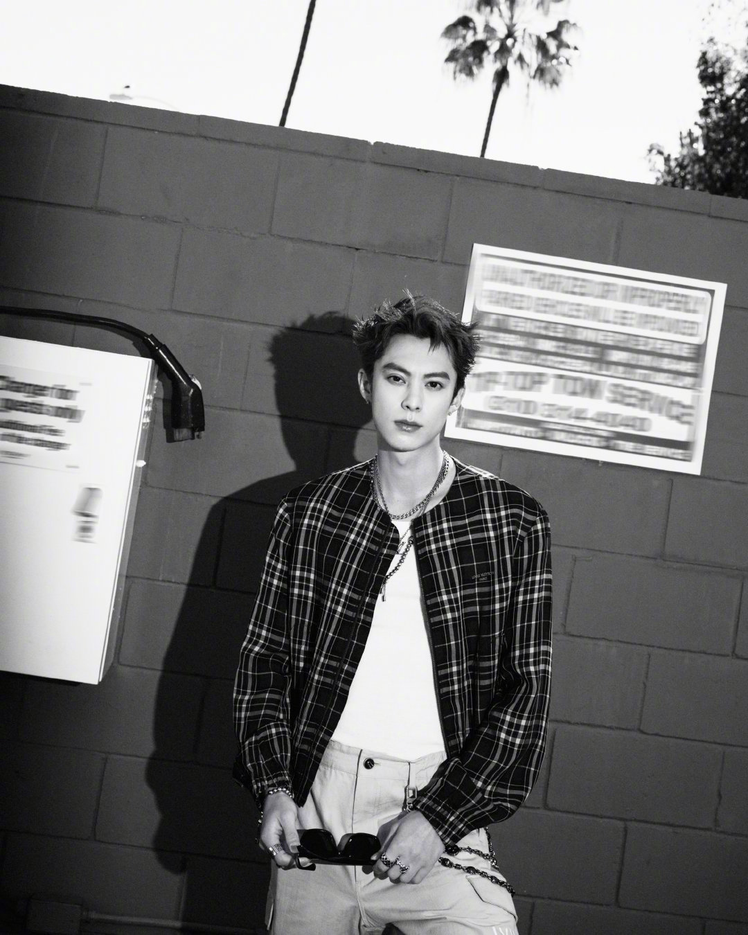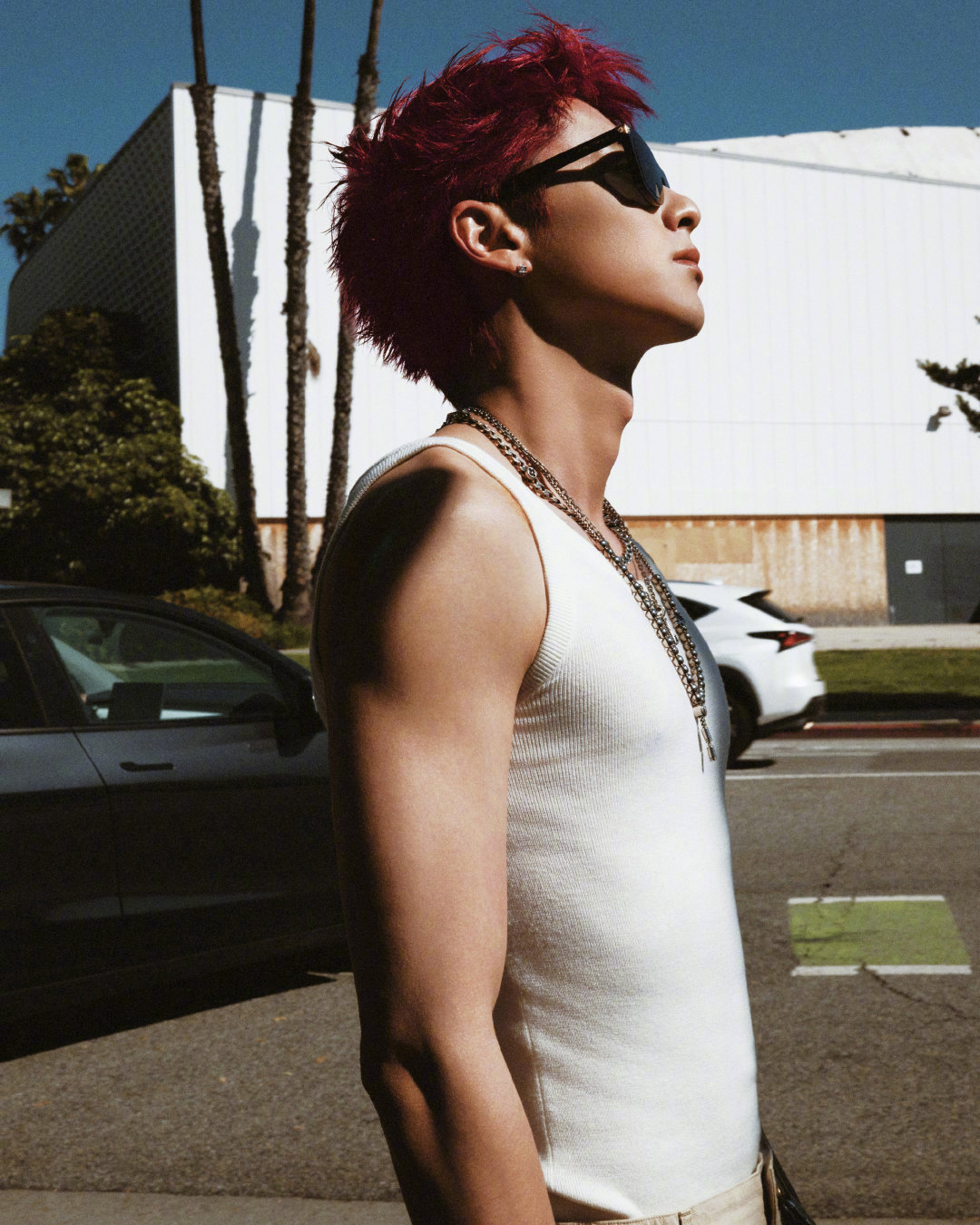 王鹤棣 NBA全明星名人赛·洛城之旅街拍,LV格纹外套内搭白背心,叠戴配饰、红色短发… 简单时髦的痞帅Style~ 🏀🕶️ 王鹤棣第三次出战名人赛