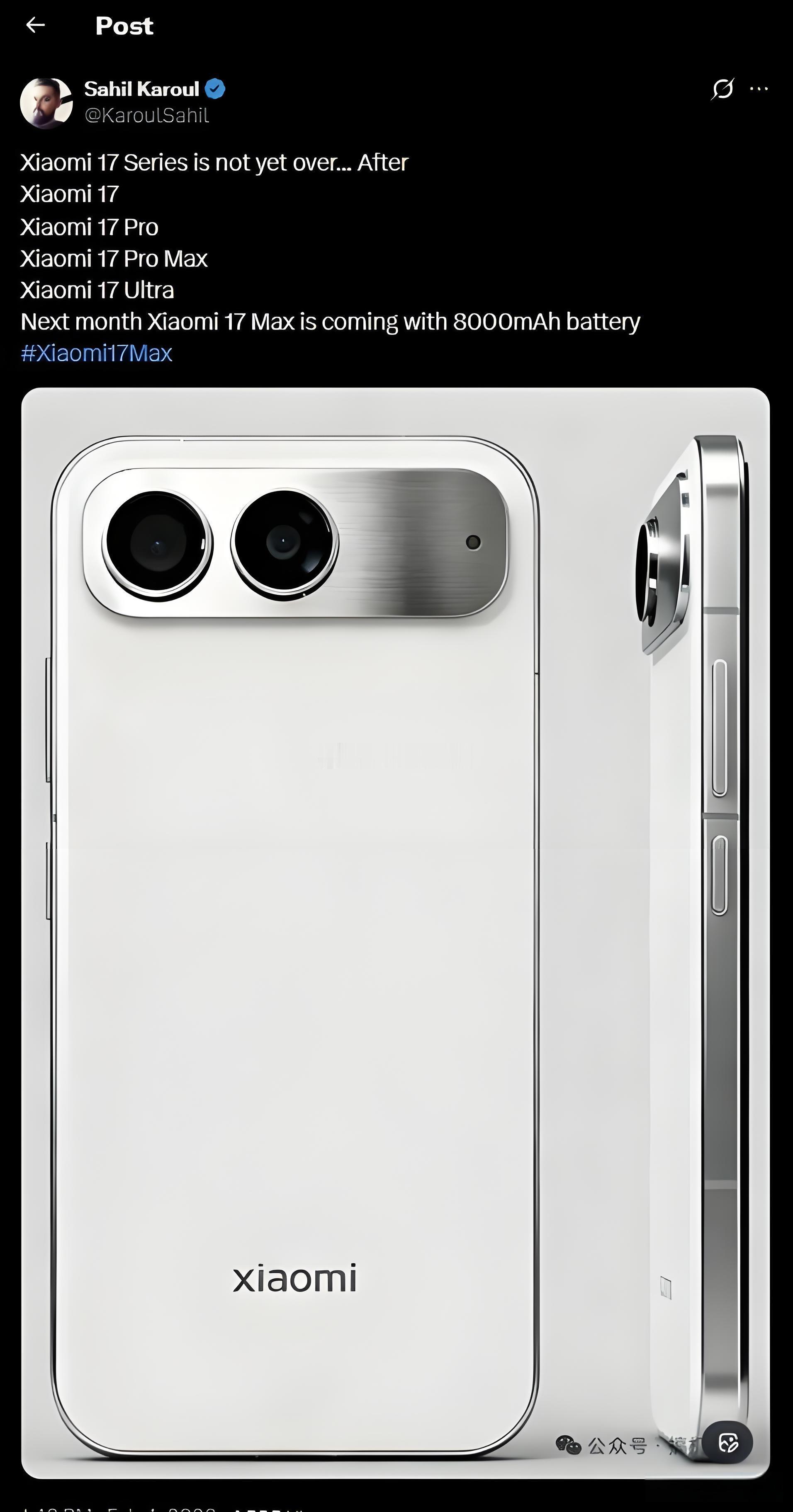 按照此前的信息,小米17 Max和标准版更像,只是去副屏版小米17 ProMax