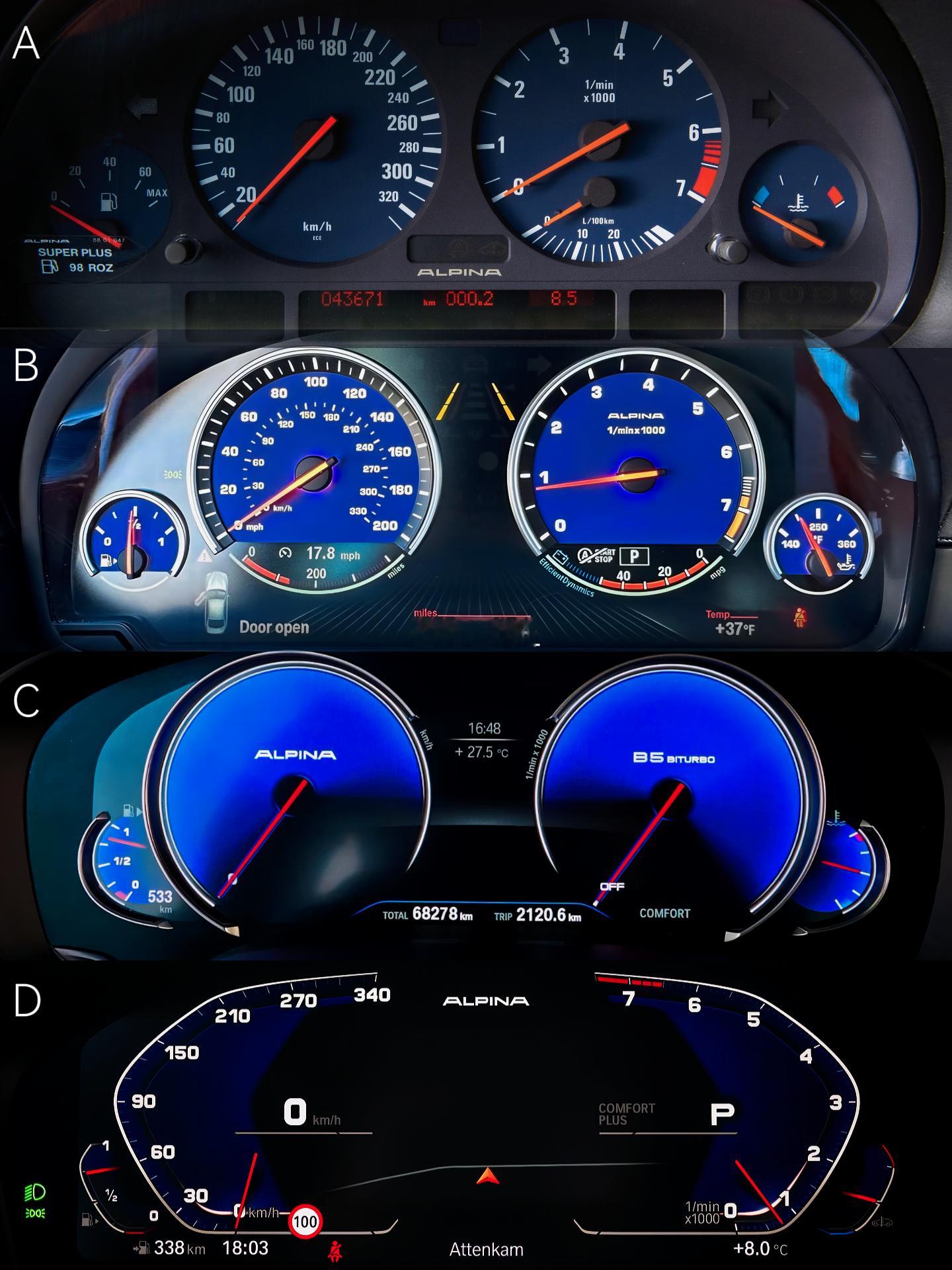 阿尔宾娜的标志性蓝色仪表,大家来看一看各代车型,你觉得哪个更好看?