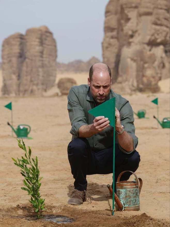 威廉王子@沙特阿拉伯的独立访问[微笑] 秉持一贯的环保主义而来,王储穆罕默德亲自接待, 在那里,王子参观了德拉伊耶遗址, 并来到野生沙兰保护区,领略当地独特风貌, 他满怀希望地在沙地中亲手种下一棵树[偷笑]