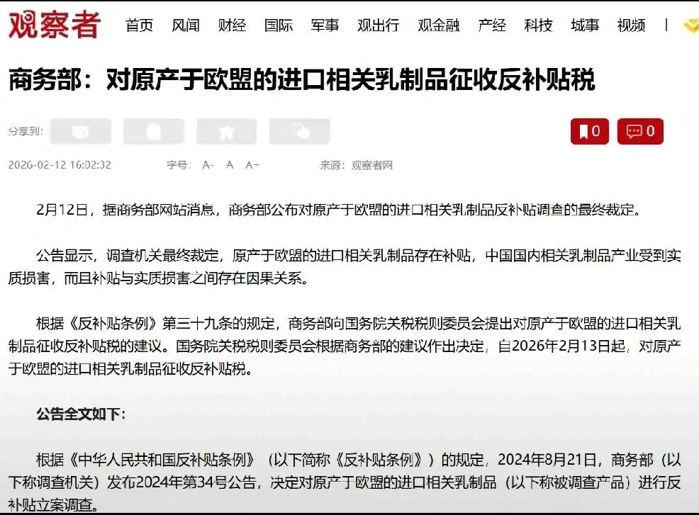 2月12日,据中国商务部网站消息,商务公布了对原产于欧盟的进口相关乳制品反倾销,调查的最终裁定,自2026年2月13日起,对原产于欧盟的进口相关乳制品征收反补贴税。 个人认为:欧盟,尤其是荷兰,又要大惊小怪了,责怪中国怎么胆敢征收欧盟的关税? 这是一起超级精准反制手段,因为欧盟出口到中国的相关乳制品大部分都是荷兰的产品。 中国好言相劝,但是荷兰依然执迷不悟,妄想做出头鸟,按着美国指示办事,那么,中国只有用南墙才能教育教育,管教管教荷兰这个小鬼了。 荷兰政府真的认为,中国企业 — 安世半导体,好欺负是吗?