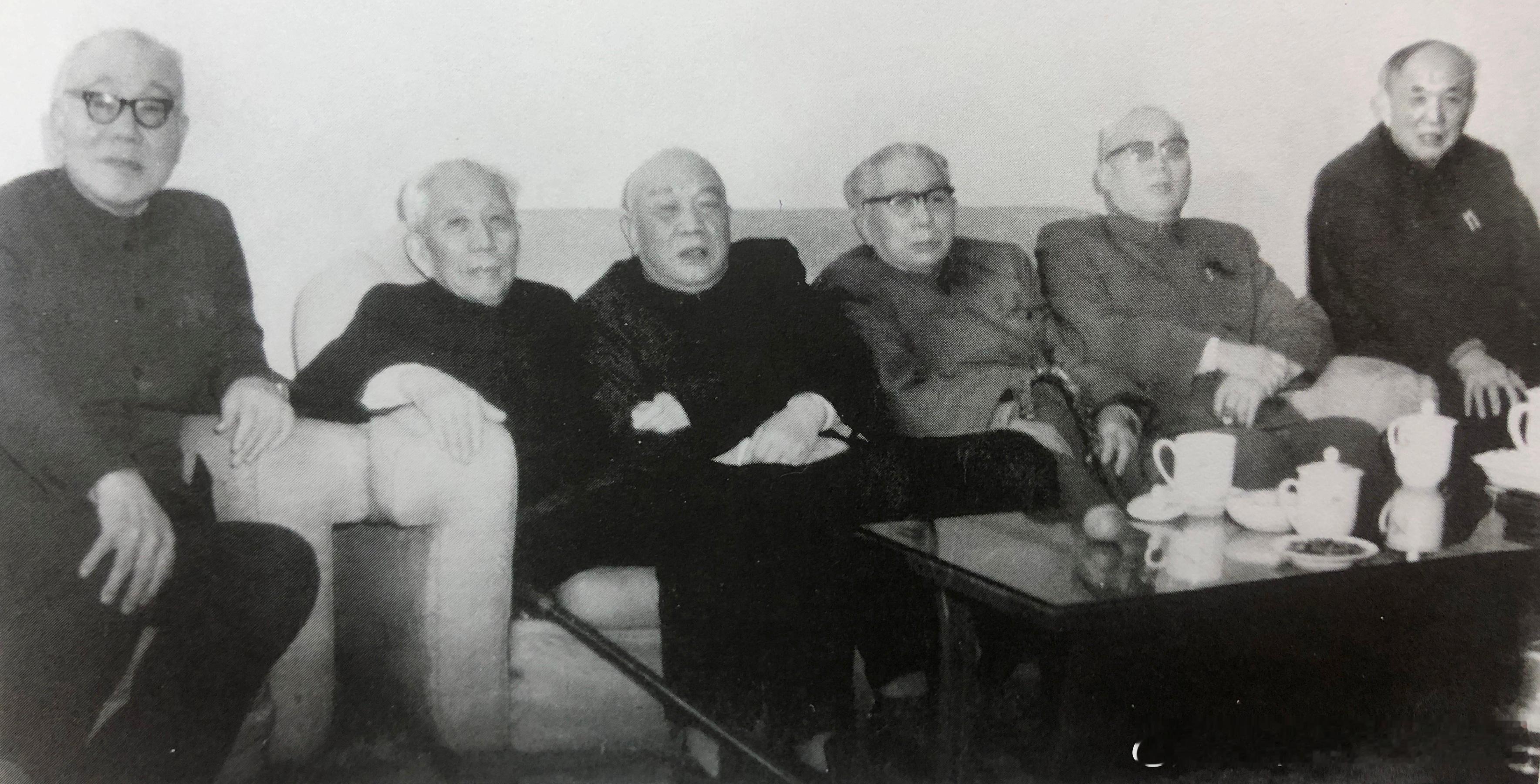 1986年10月参加庆祝新疆维吾尔自治区成立30周年活动期间,359旅老战友们合影。左起苏进、国家副主席王震,政协副主席、新疆维吾尔自治区书记王恩茂、沈阳军区顾问贺庆积、新疆军区司令员谭善和、兰州军区副司令员黎原历史影像
