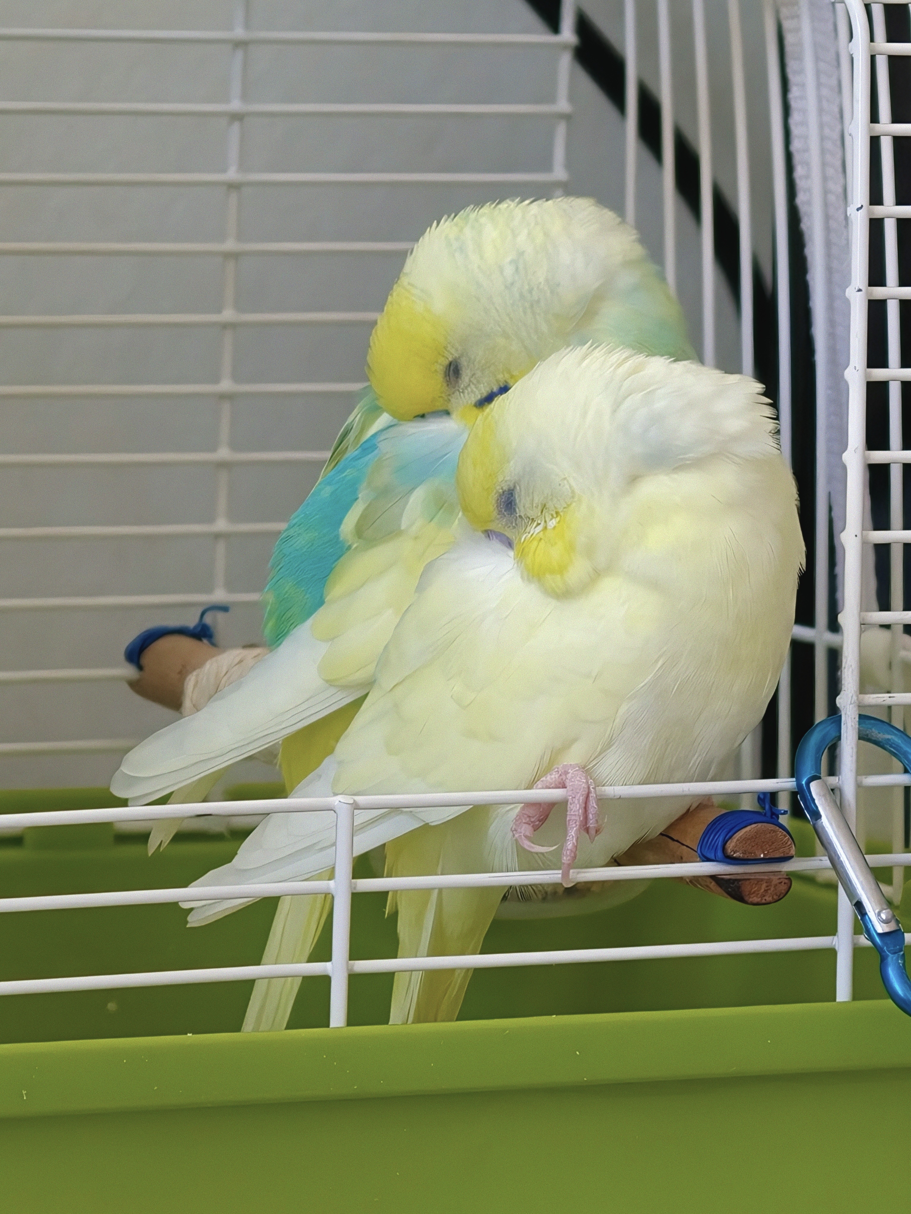 这俩货玩累了,终于睡觉了鹦鹉小蓝和布丁