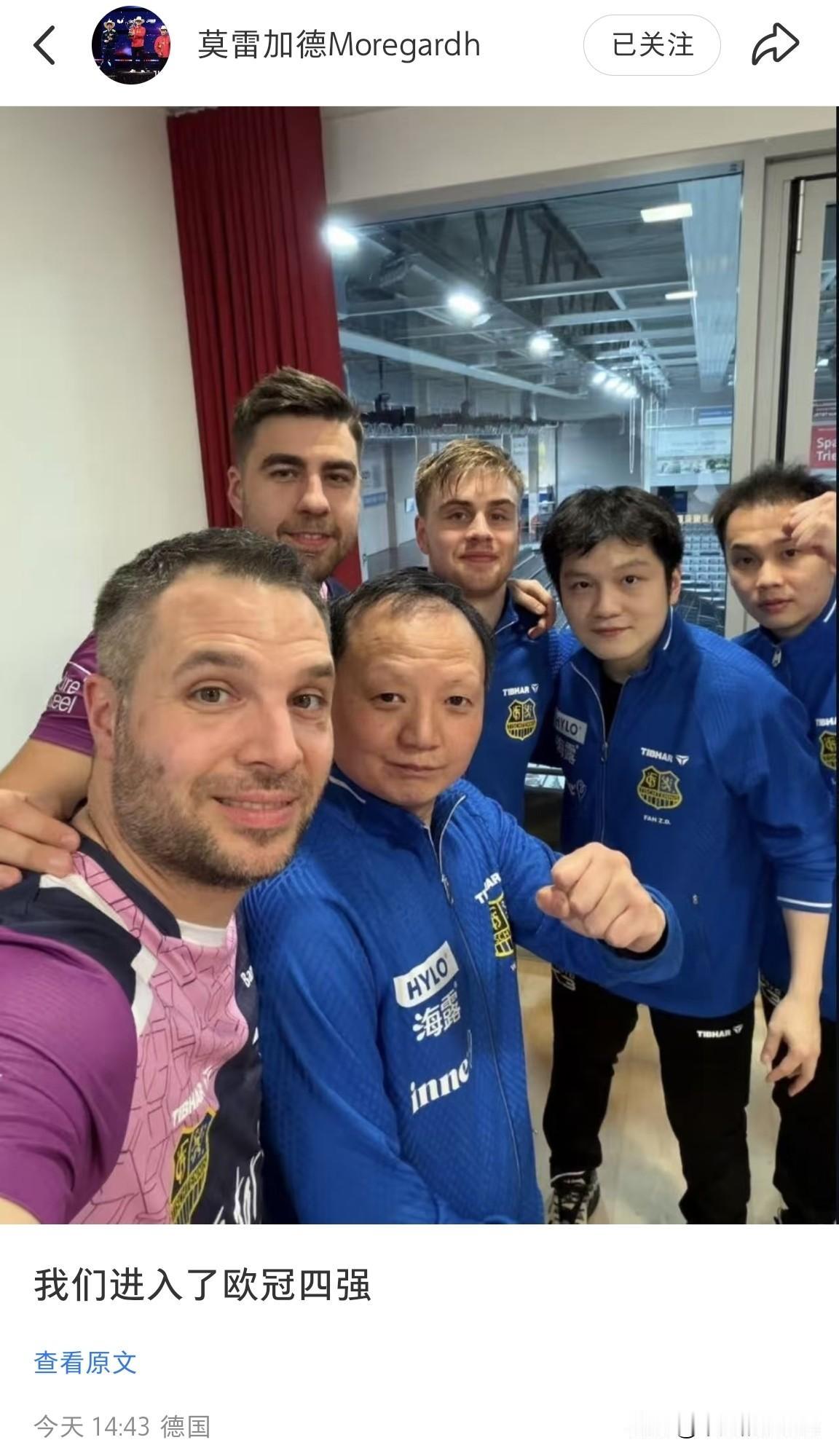 2月14日,瑞典运动员莫雷加德更新动态,并配文“我们进入了欧冠四强”。 难怪小莫和东东都打得这么开心,希望他们能夺得冠军。 小莫发了一张合照,但我只认识东东、莫雷加德、达科和王教练。 东东能遇到小莫这样的队友,真的很幸运呀。 小莫长得帅,性格幽默,他又喜欢东东,希望两人友谊长存,大家觉得呢?
