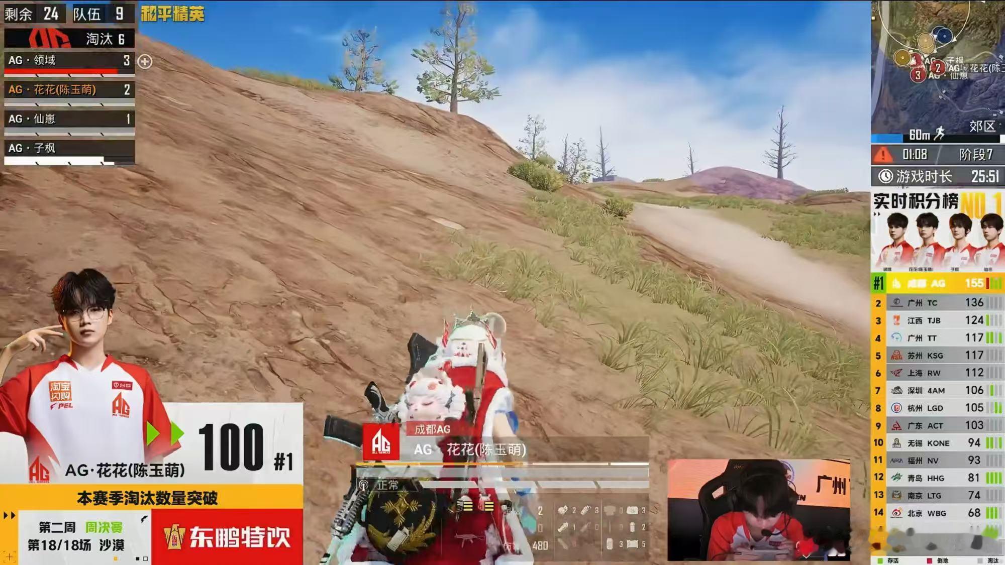 AG花花再夺淘汰王 花花连续两周获得淘汰王,太猛了,还是春季赛第一个突破100淘汰的选手。AG和平精英