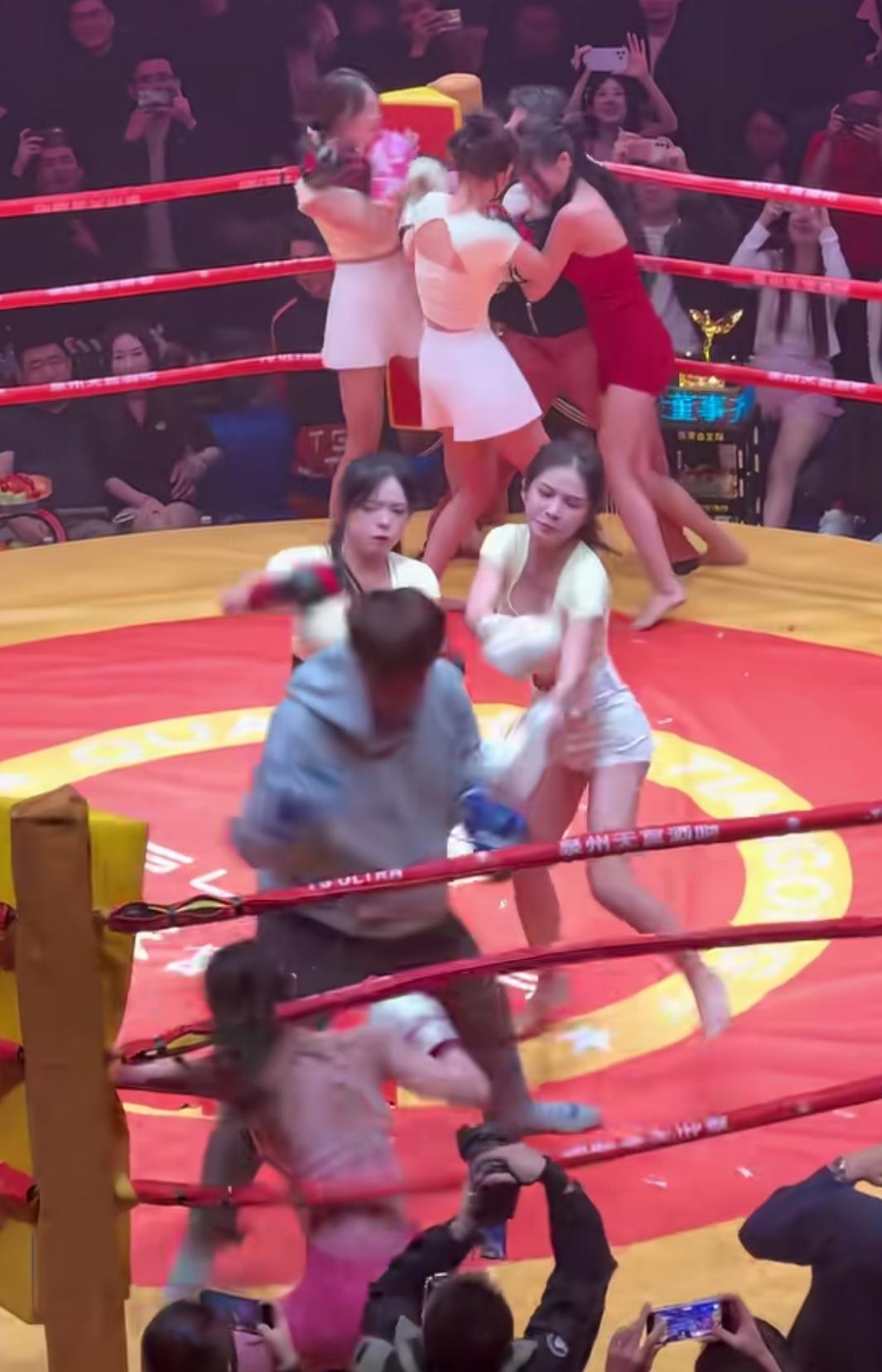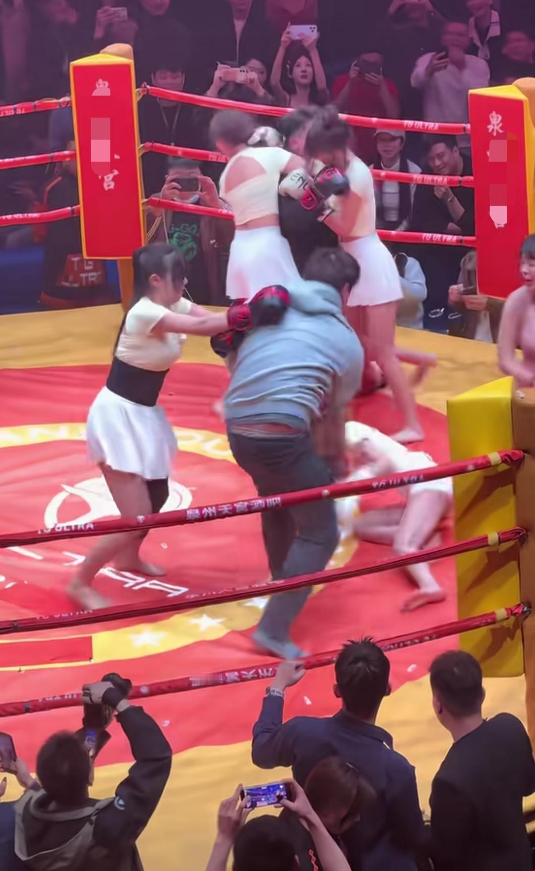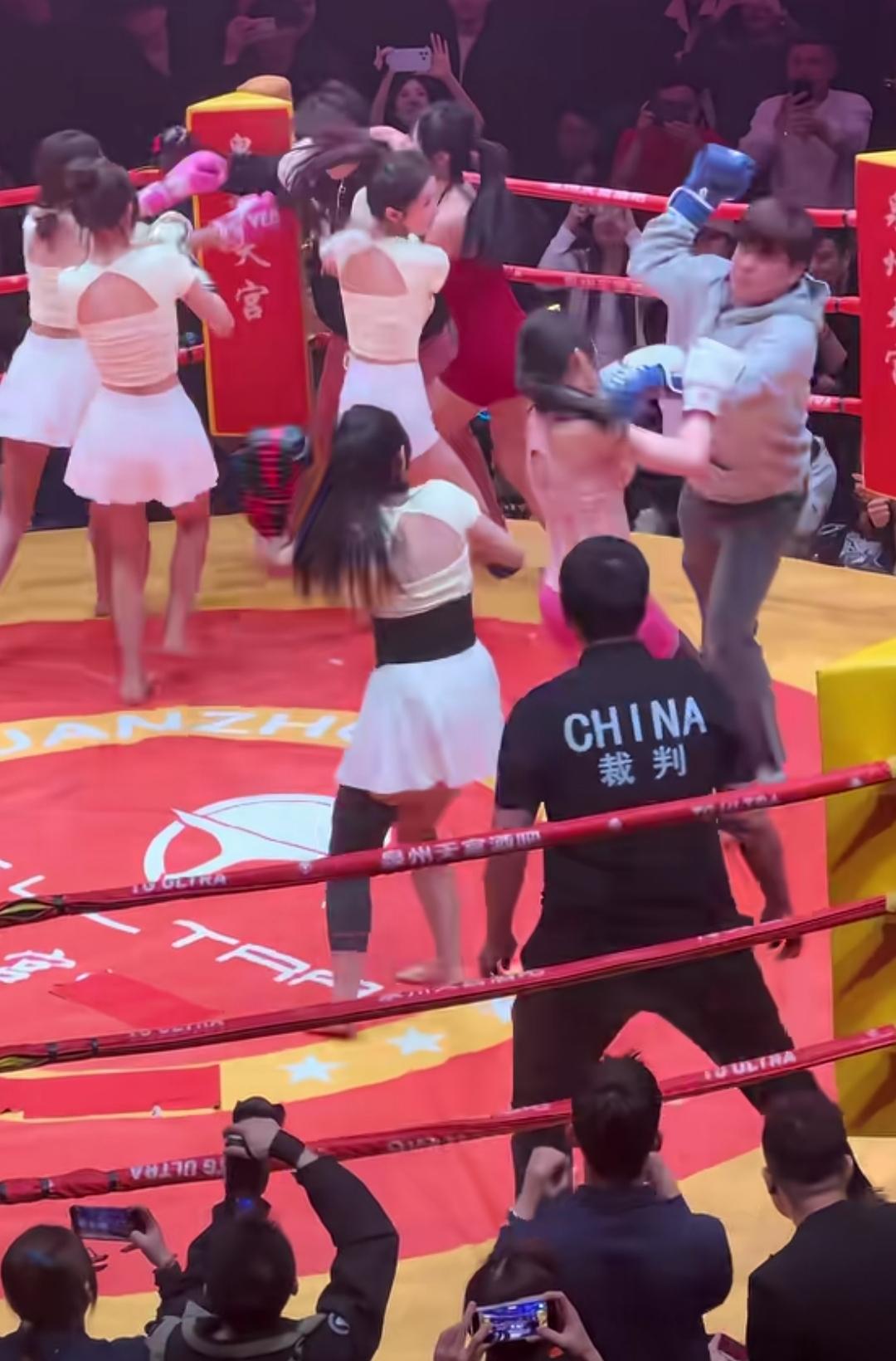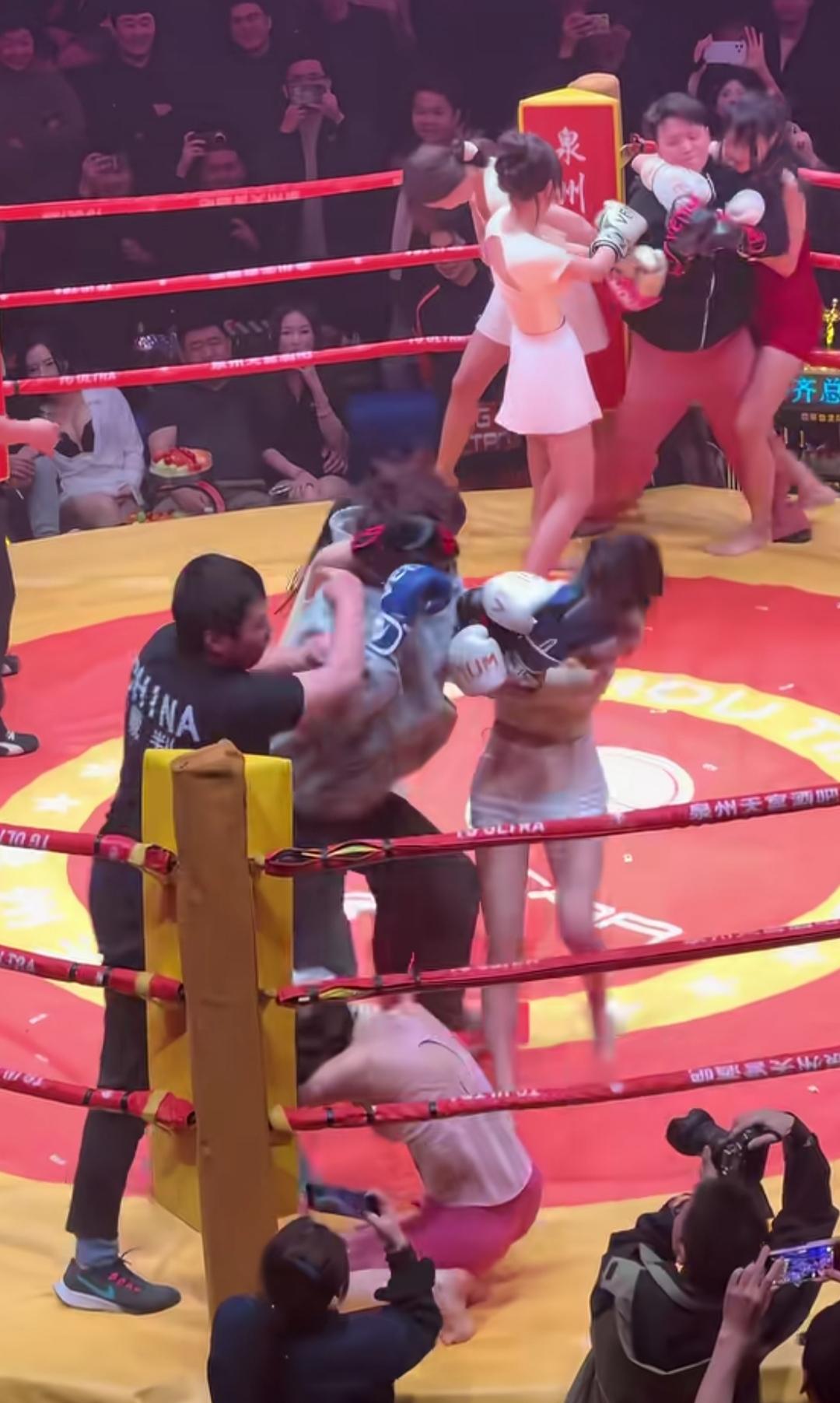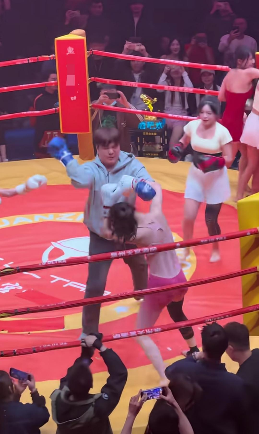 泉州某酒吧,把舞池改成拳击台,这创意简直太有才了! 看了一会,没笑死,灰衣小哥心中无女,上来就玩真的,把一个小妹妹“打倒”在地,一点也不懂怜香惜玉! 还是另一个黑衣小哥懂人情世故,被三个妹子“围攻”,几乎动弹不得,乐不思蜀。 不知道这样有趣的活动参加一次需要多少银子。