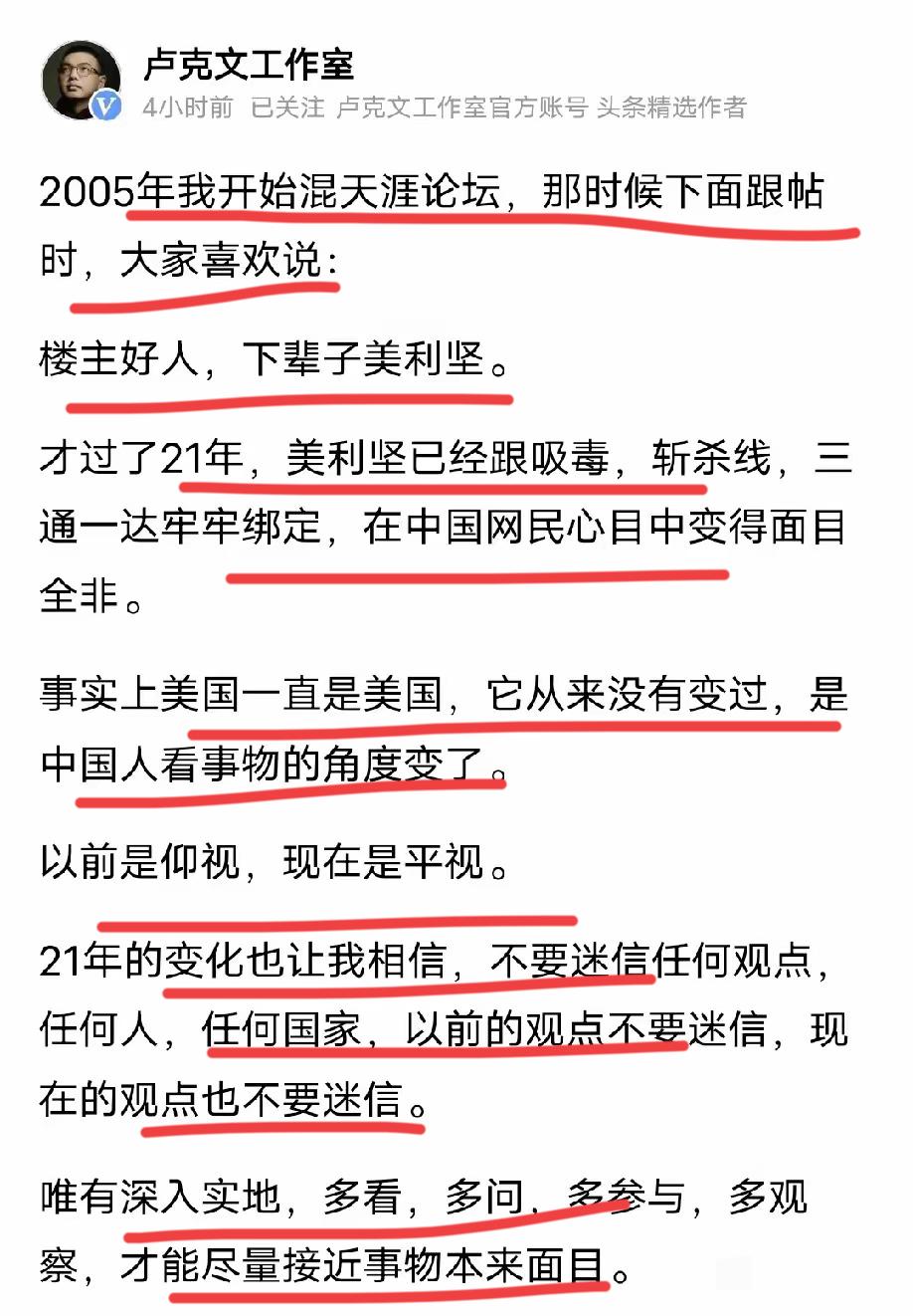 卢克文:不要迷信事物,坚持实地研究,才能接近和看清事物的本质!! 牢A提出美帝斩杀线理论之后,卢总非常认同,大法感叹,感觉他有点遗憾,为何这么重要的发展,不是他提出来的,而是一个名不见经传的小辈?? 其实一点也不奇怪,还是卢总自己说的,实地研究,没有调查就没有发言权嘛! 卢总这几年坚持全球实地考察,去过了大多数国家,但遗憾的是没有机会去英美,不是不想去,而是签证通不过! 价据卢总之前透露,三次被美帝拒签,后来他终于明白了,美帝是犹太资本控制的,他写了那么多反犹的文章,已经被美帝列入黑名单了!网友说,不要去了,被犹太人盯上很危险,小命不保都有可能,还是国内安全! 当然,没有去美帝研究,让卢总失去了发展斩杀线理论的机会,还是很遗憾的,要不然,爆的大名的人,就不是牢A而是老卢了,你觉得??