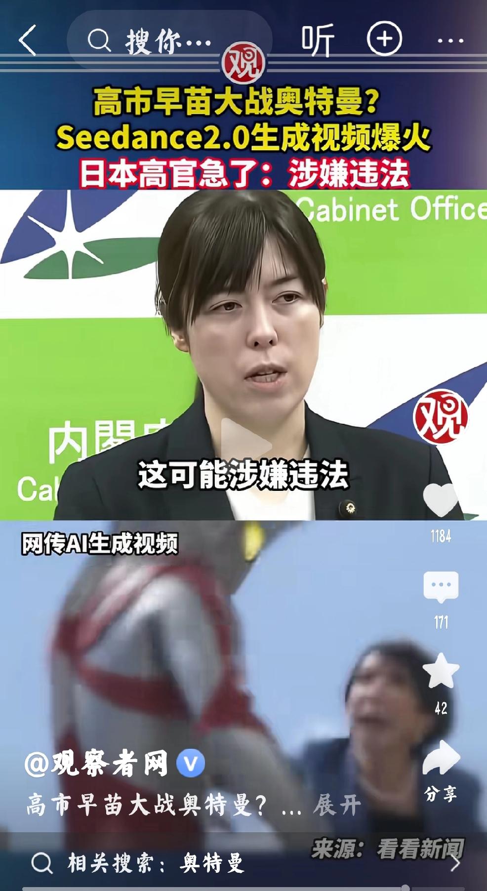 据观察者网报道,近日,抖音母公司字母跳动发布了最新人工智能视频模型Seedance2.0预测版本,一经推出迅速爆火,一段由AI生成,《日本首相高市早苗与奥特曼战斗》的视频在社交媒体上疯传,日本AI战略担当大臣小野田继美,宣称:“涉嫌违法” 个人认为:恐怕令大批日本漫画迷失望了,因为高市早苗上台以来,种种的行为表现语言都是所谓的漫画化,这招致大批日本年轻人深受鼓舞,哪曾想都是:“假的,受骗了,因为,这位女首相都是演戏,经不起开玩笑。” 个人认为:这不是日本人制作的,显示自己首相与普通民众和谐共处,共同进退的象征吗?怎么还违法了? 高市早苗与奥特曼,果然让人浮想联翩