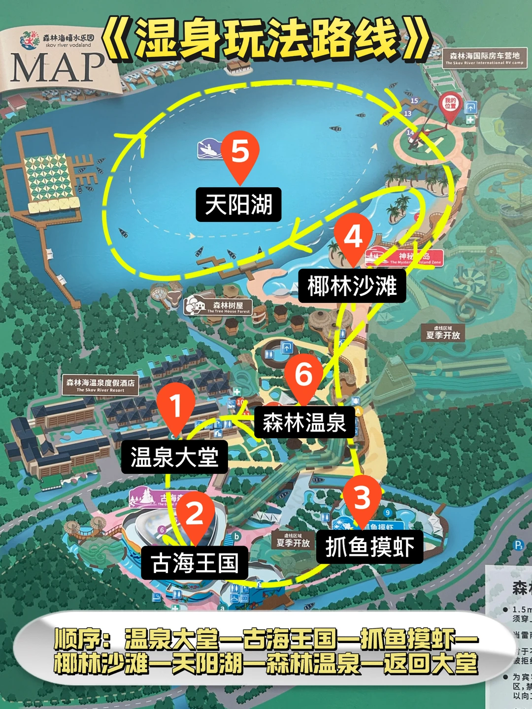温泉大堂➡️森林温泉➡️椰林沙滩➡️天阳湖➡️抓鱼摸虾➡️古海王国➡️返回大堂