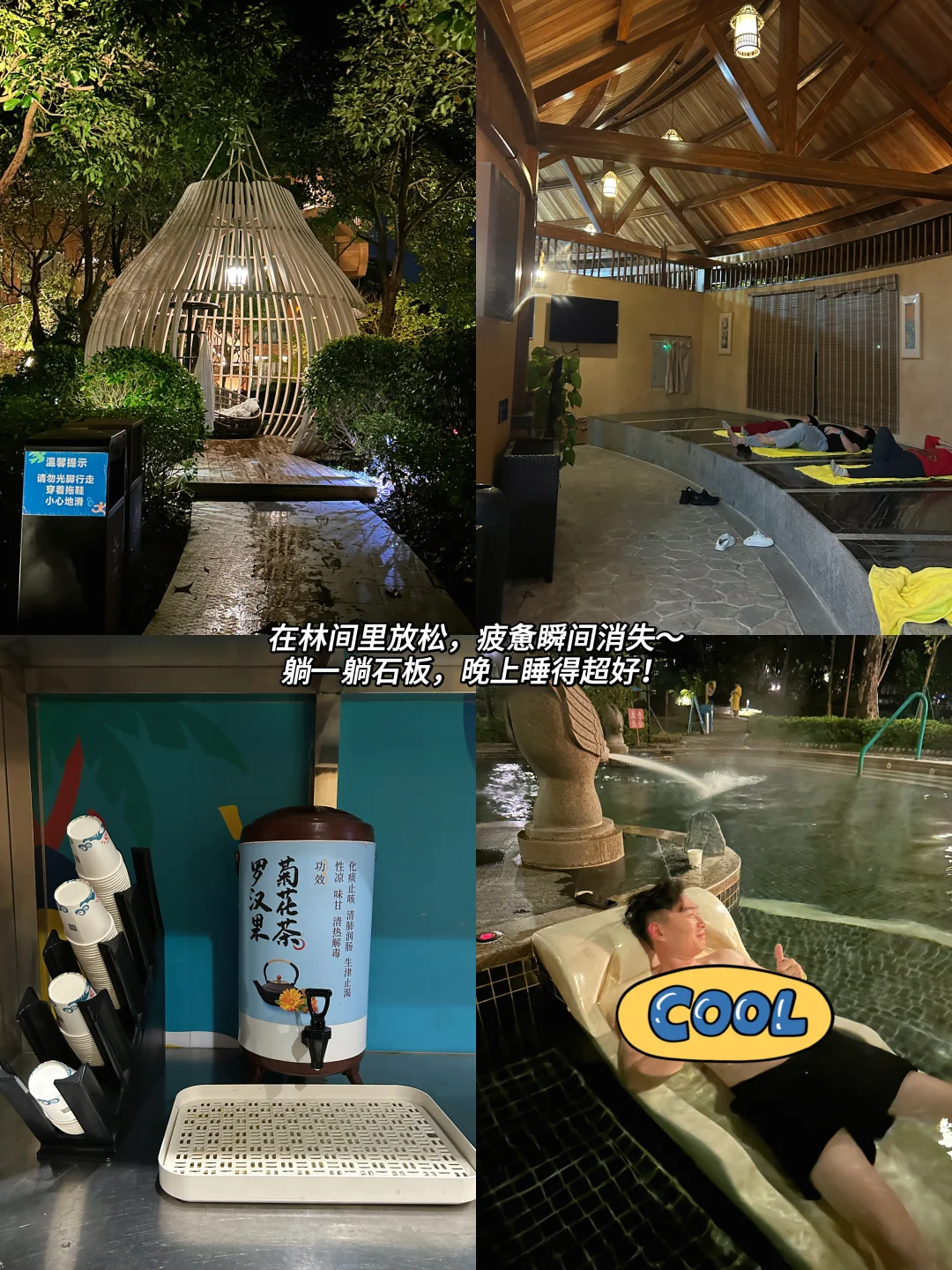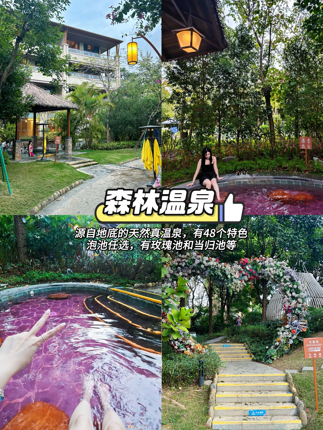 源自地底的天然真温泉,有48个特色泡池任选,有🌹玫瑰池和当归池等,泡温泉放松,晚上睡得超好