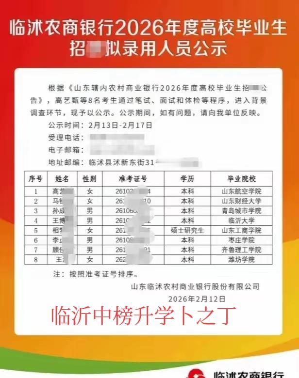 临沂(临沭县)农商行的招聘出来了,同学们分别毕业于山东航空学院、山东财经大学、青岛城市学院、临沂大学、山东工商学院、枣庄学院、齐鲁理工学院、潍坊学院。其中有名牌一本大学,也有民办本科,不知道有没有专升本。欢迎大家留言文明交流!