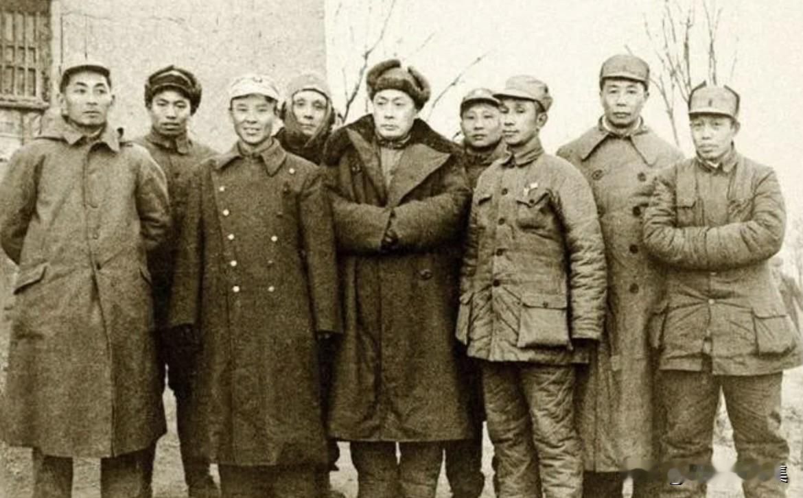 1947年初,左起:叶飞、丁秋生、韦国清、邓子恢、陈毅、唐亮、粟裕、陈士榘、谭震林等摄于宿北和鲁南战役之间。会议结束后不久,1947年1月2日至20日,华东我军发动鲁南战役,一举歼灭国民党军两个整编师师部、四个旅及一个快速纵队,共5.3万余人,缴获大量坦克、汽车和重炮,为我军组建特种兵纵队奠定了物质基础。此役是华东战场一次空前的大规模歼灭战。