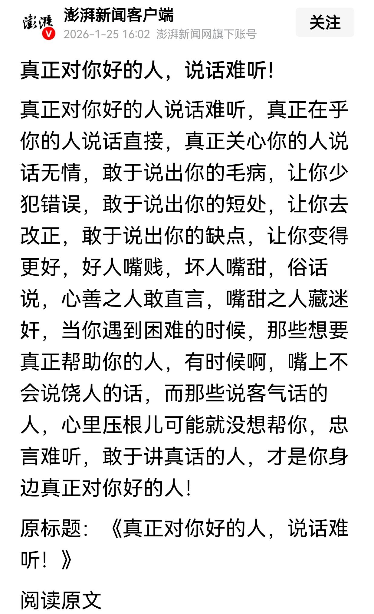 至少我认为,“忠言逆耳利于行”是肯定的。 对于“我的”不足或错误,如果是为我好,就应该跟我说出来、让我及时改正是完全可以接受的,而不是因为“不好意思”“怕我不乐意接受指正”而不告诉我!那样我便不能及时学习新知识或纠错了!至于难听,可能是表达方式、语气语调的形式不同,至少我认为这个并不是最重要的,毕竟有就话说“听话要听音”,重要的要听其中的内涵,而不是其他修饰性的东西,包括语气、语调之类。