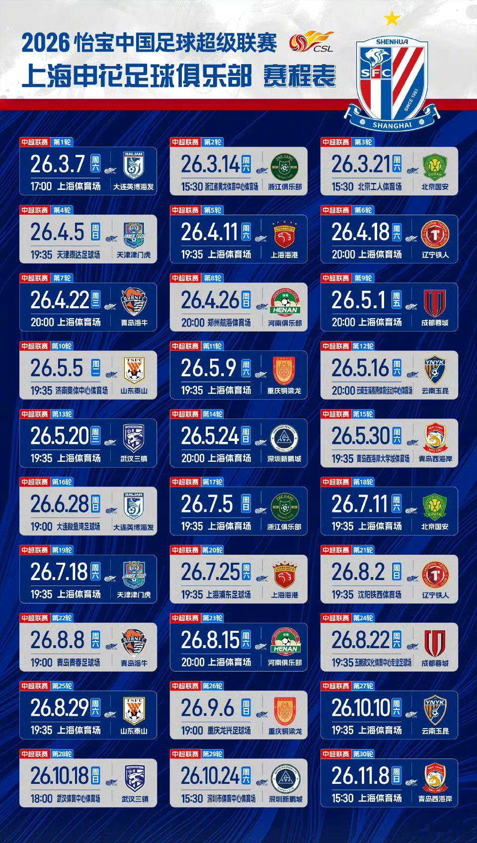 2026 中超联赛完整版赛程已经公布!申花 3 月 7 日首轮主场对大连英博。 3 月14 日、21 日和 4 月 5 日连续征战浙江、国安和津门虎客场。4 月 11 日主场对上海海港。 图五是上海申花 2026 赛季的赛程安排。上海申花