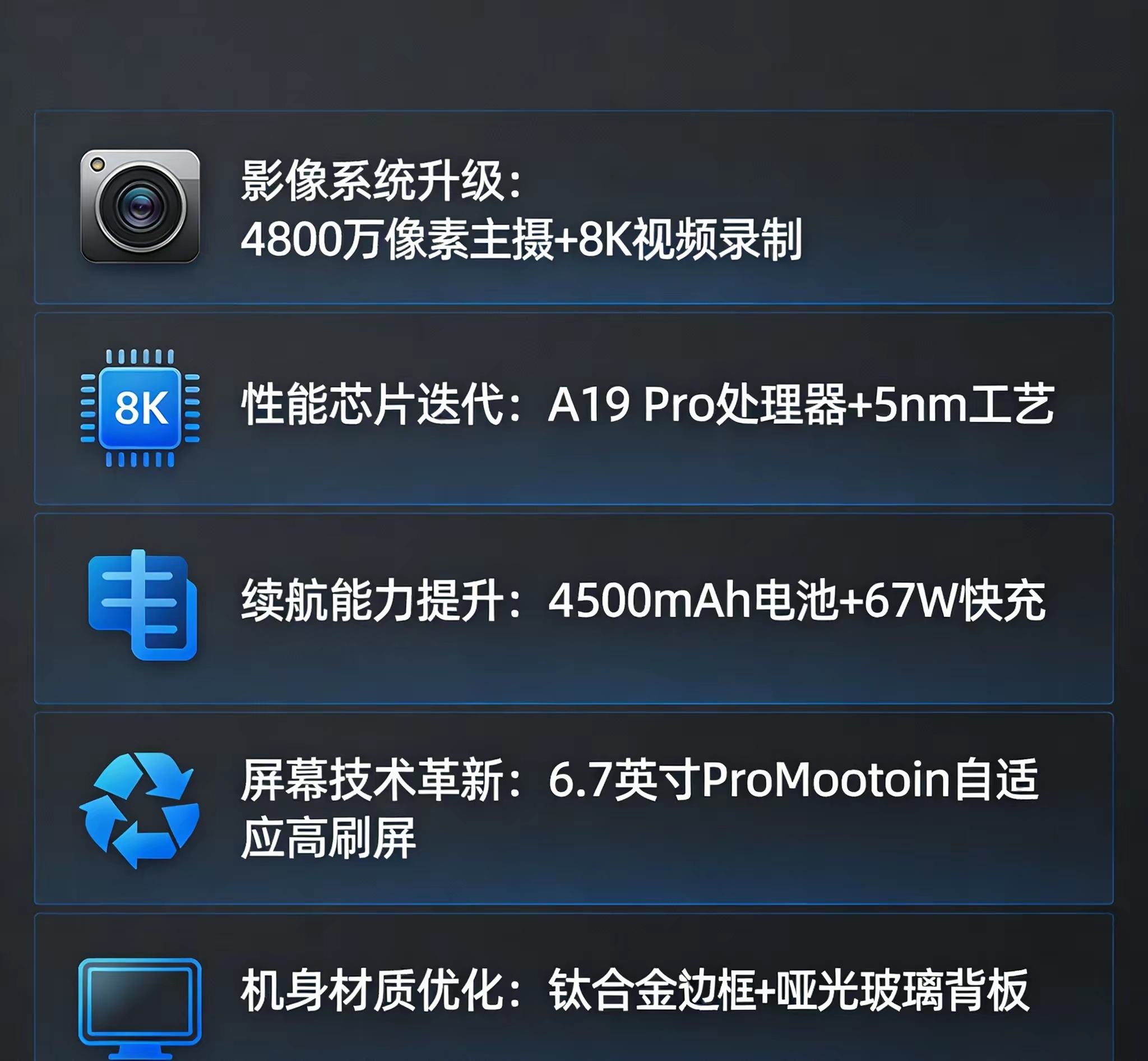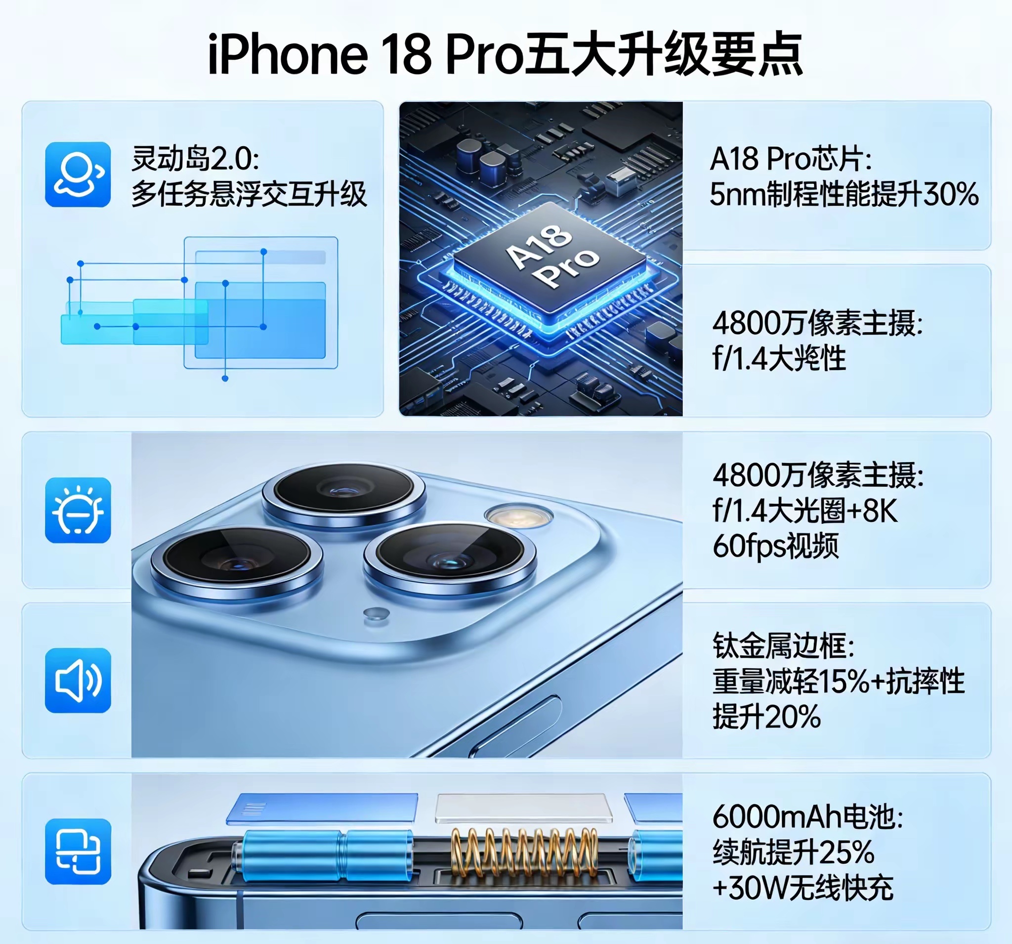 iPhone18Pro五项新功能iPhone 18 Pro这波升级看起来是真有料,灵动岛要更小、主摄支持可变光圈、芯片直接上2nm的A20 Pro,还加了新N2芯片和C2基带。性能、影像、连接全线拉满,感觉苹果这次是要真刀真枪地堆料了。不过可变光圈真能拉开差距吗?你最期待哪个功能?