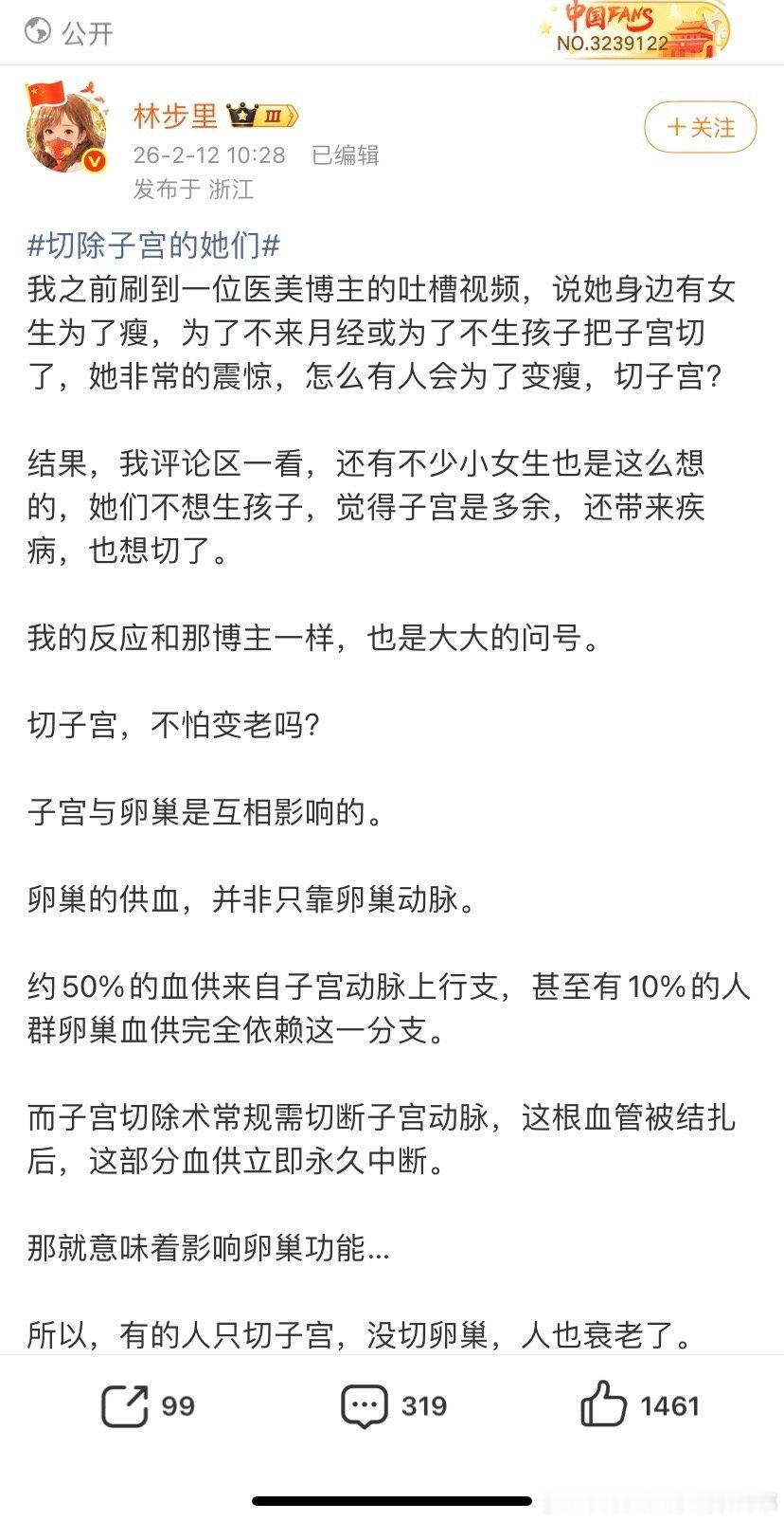 看到那些说切zi宫的帖子就想笑,现在生育率这么低,连女性节扎医院都不太愿意做,之前有博主说自己生了2个孩子了,想节扎,医院都不肯做,子宫才一个鸡蛋这么大,还切了变瘦,变你个头啊,你倒是发手术病例啊,发手术单子出来啊,某书有一些说切的,我评论一问都是子宫有病变的,医生要切给她们保命了,还拉黑我,脑子有病