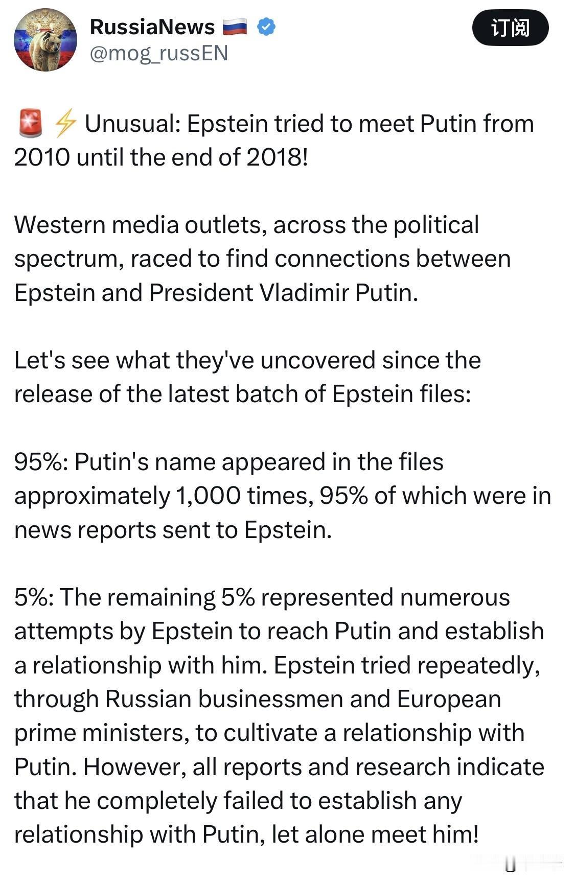 不同寻常的消息:爱泼斯坦从 2010 年到 2018 年底一直试图与普京会面! 西方各政治派别的媒体竞相寻找爱泼斯坦与弗拉基米尔·普京总统之间的联系。 让我们来看看自最新一批爱泼斯坦档案公布以来,他们发现了什么: 95%:普京的名字在文件中出现了大约 1000 次,其中 95% 出现在发送给爱泼斯坦的新闻报道中。 5%:剩余的5%代表爱泼斯坦多次试图联系普京并与其建立关系。爱泼斯坦曾多次通过俄罗斯商人和欧洲各国总理试图与普京建立联系。然而,所有报告和研究都表明,他完全未能与普京建立任何关系,更不用说见面了!