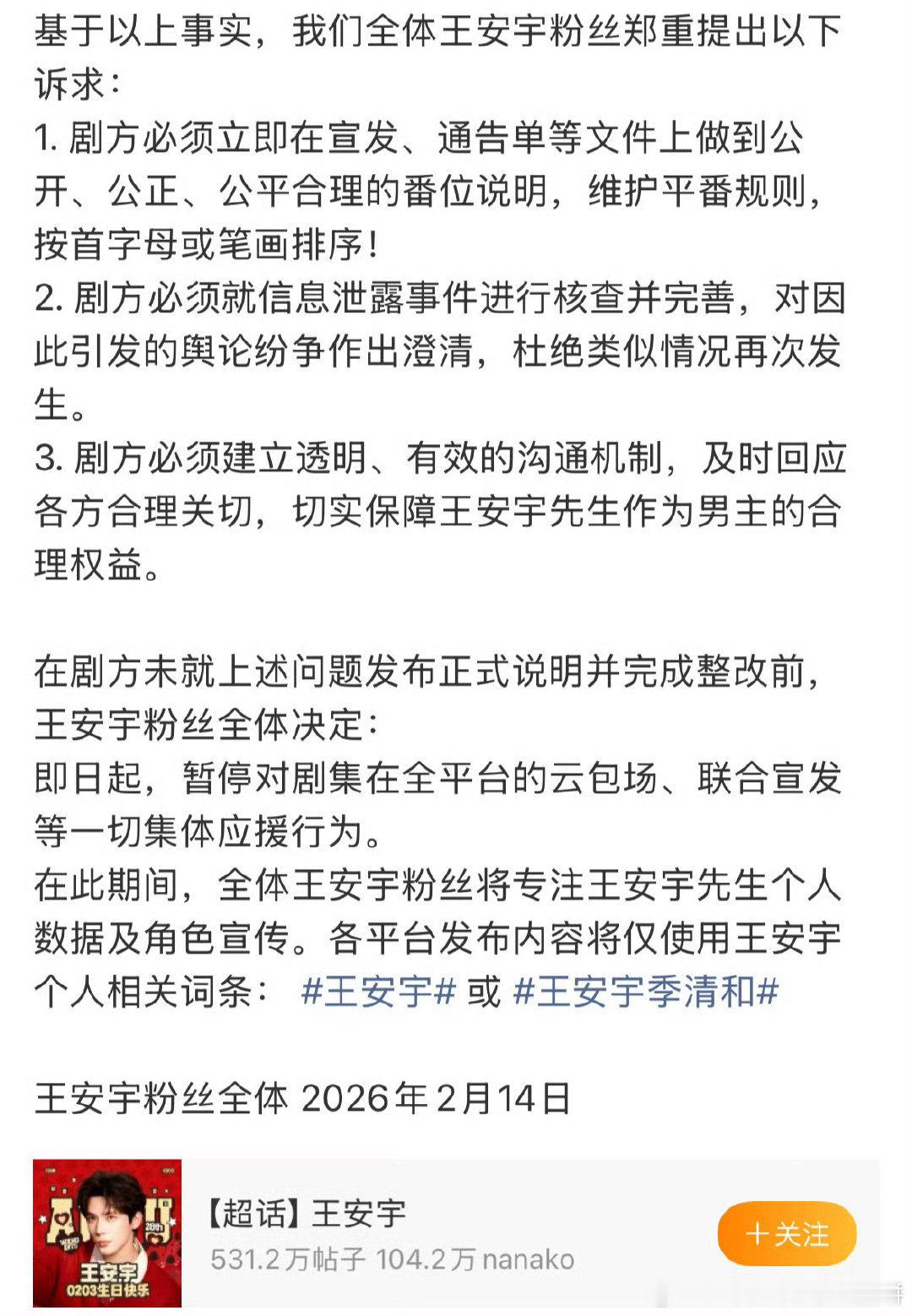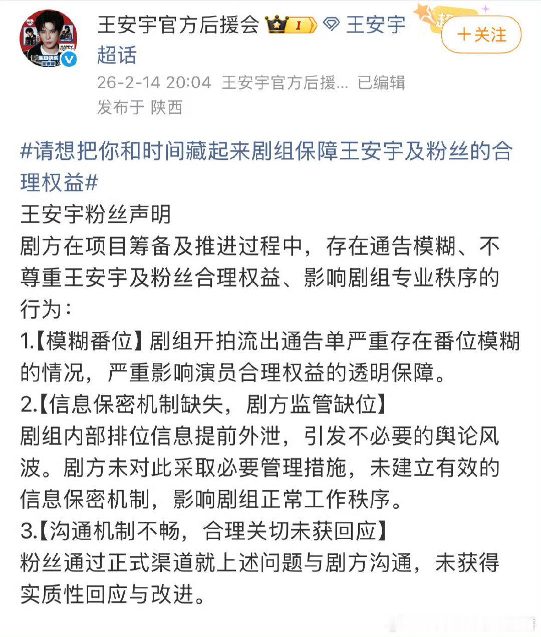 王安宇后援会全体粉丝向《想把你和时间藏起来》剧组提出诉求: