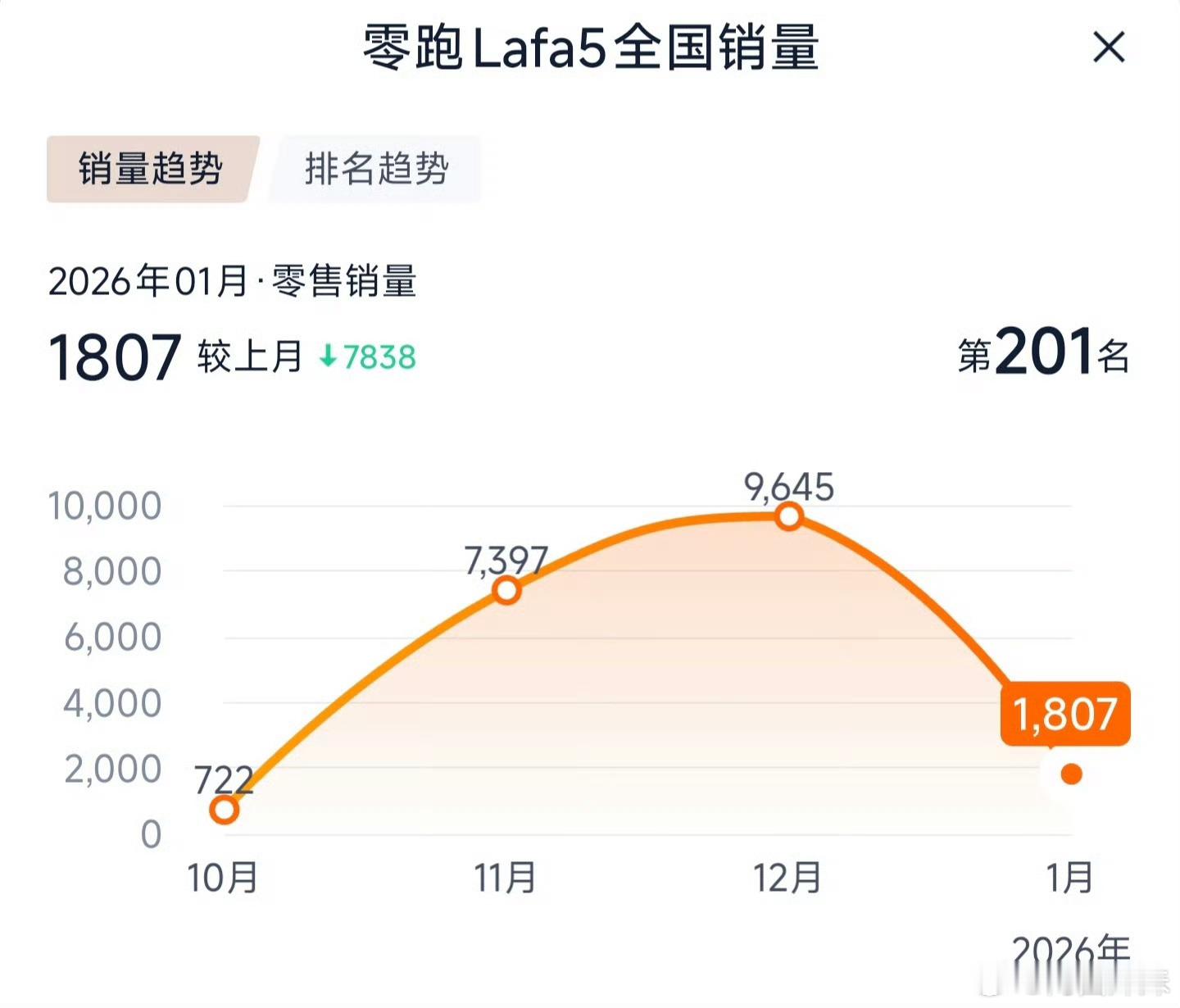 零跑Lafa5 一月份销量只有1807台,跟12月份销量相比差距太大了,过完年应该会好点,毕竟才上市刚两个月。