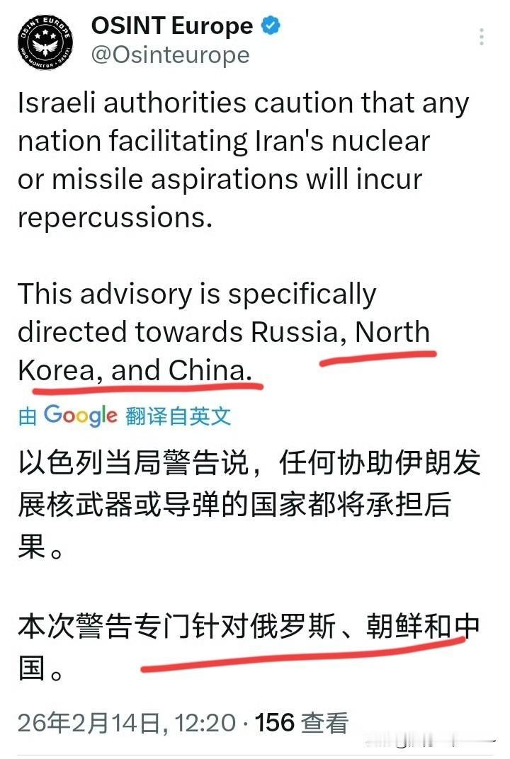 外网消息: 以色列当局警告说:任何协助伊朗发展核武器和导弹的国家将承担后果。后面呢还重点列举了几个国家。 这个消息啊,咱不能确定是不是准确,毕竟是在外网上的。 但是呢,我认为以色列如果真的这样说的话,那可真是有点猖狂了,别说是不让伊朗发展核武器和导弹了,就连伊朗发展民用核能力的权利都不想给,自己却一心想称霸中东,在中东想欺负谁就欺负谁,现在搞得中东某些地方满目疮痍,你们承担了多少后果?还有脸警告别人?