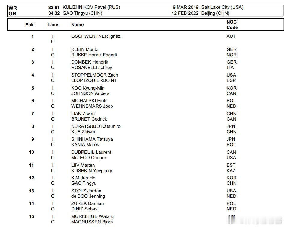米兰冬奥会速度滑冰男子500米2月15日00:00开赛,卫冕冠军高亭宇携廉子文、薛智文并肩出击。