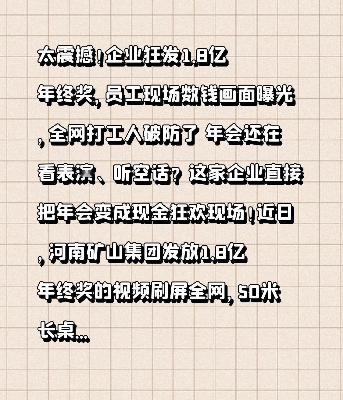 太震撼!企业狂发1.8亿年终奖,员工现场数钱画面曝光,全网打工人破防了 年会还在看表演、听空话?这家企业直接把年会变成现金狂欢现场!近日,河南矿山集团发放1.8亿年终奖的视频刷屏全网,50米长桌堆满现金山、40台点钞机同步运转,员工上台限时数钱、数多少拿多少,画面燃爆全网,打工人看完直呼:这才是过年该有的样子! 视频里,红彤彤的百元大钞码得整整齐齐,堆成半人高的钱墙,没有花哨节目、没有冗长讲话,全场只有真金白银的诚意。员工代表轮番上台,手指飞快捻钞,台下同事齐声加油,有人10分钟数出9.1万,核验后拿走8.9万,数到手指发红、胳膊发酸,脸上却笑开了花。 一开始很多人质疑:是不是摆拍作秀?博眼球炒热度?毕竟市面上“画饼”企业太多,真金白银拿出上亿发年终奖,简直不敢信。 转折点来了!真相曝光,全网彻底服了! 企业全年利润仅2.7亿,直接拿出1.8亿回馈员工,占比超三分之二;现场现金发放6000万,剩余1.2亿线上足额转账,还主动缴纳900多万税款,每一分钱都合规透明。老板更是当场加码:追加300万、延长数钱时间,一线员工、家属全都有份,单人最高能拿500万,没有套路、不搞克扣。 更戳人的是,这不是第一次发钱。老板深知打工人不易:房贷车贷压身、一线辛苦整年,最实在的关怀,就是把钱揣进员工口袋。不画饼、不拖延,用最直接的方式,致敬每一份付出。 这一幕看哭无数打工人。我们想要的从不是天价奖金,而是付出被看见、努力被尊重;企业最大的底气,从来不是赚多少钱,而是愿意和员工共享成果。好老板不画饼、重实干,好企业不压榨、共富裕,这样的诚意,比任何口号都动人。 1.8亿发的是奖金,暖的是人心;数的是现金,守的是良知。愿所有打工人都能遇良主、劳有所得,愿所有企业都能怀诚意、共赢发展。 为这样良心企业点赞!羡慕的话,点赞转发,把好运带回家,新一年财源滚滚!