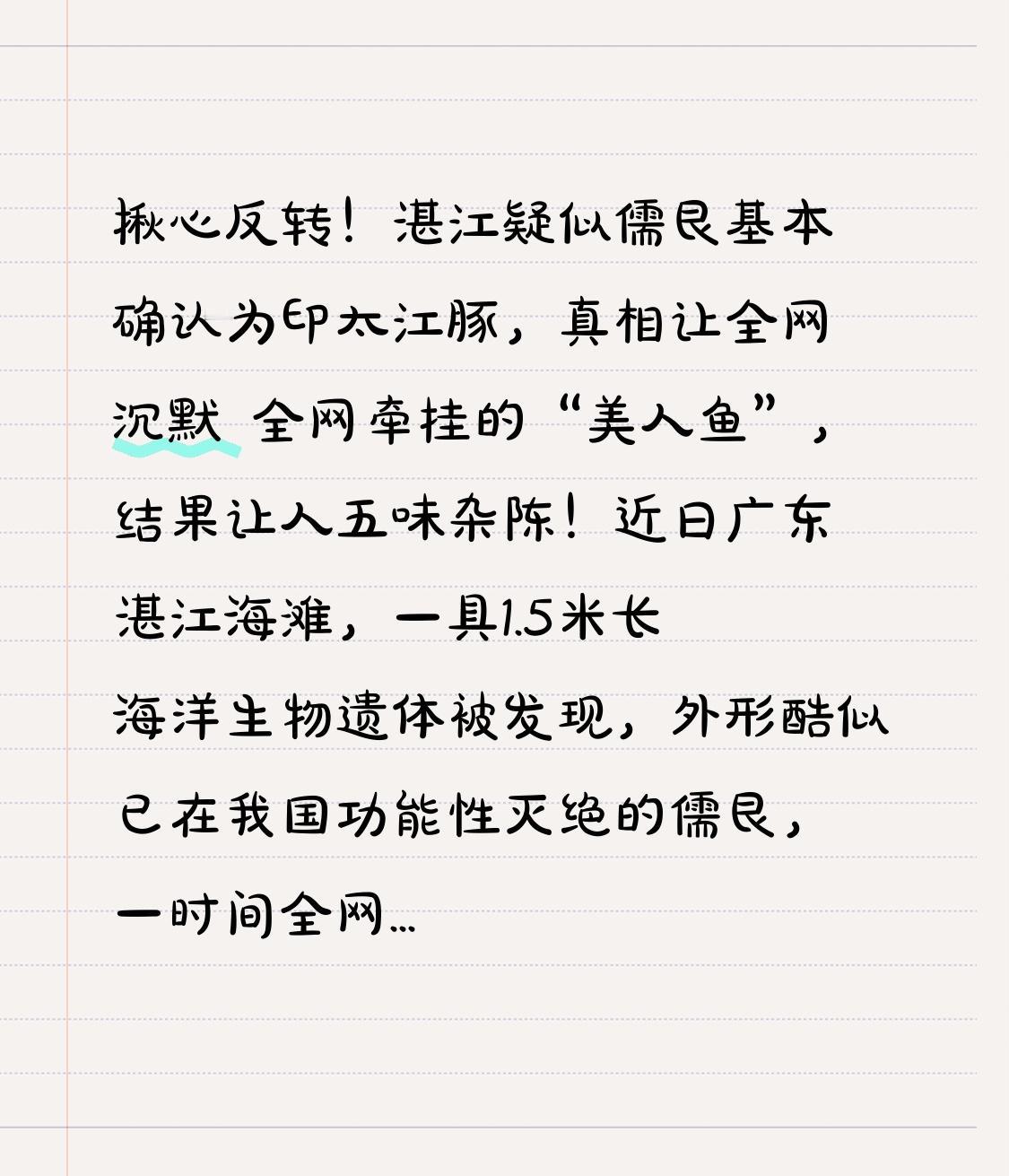 揪心反转!湛江疑似儒艮基本确认为印太江豚,真相让全网沉默 全网牵挂的“美人鱼”,结果让人五味杂陈!近日广东湛江海滩,一具1.5米长海洋生物遗体被发现,外形酷似已在我国功能性灭绝的儒艮,一时间全网沸腾,大家既期待种群重现,又心疼它以这样的方式出现。 无数网友留言祈祷:希望是儒艮,证明它们还在;又怕真是儒艮,再也回不到曾经的家园。一时间,关于“美人鱼归来”的消息刷屏,所有人都在等最终结果。 转折点来了!官方鉴定出炉:不是儒艮,是国家二级保护动物印太江豚。专家通过胸鳍、牙齿、体型等关键特征综合判定,遗体为成年雄性印太江豚,目前已按规定做无害化处理。 一场乌龙,却戳中了所有人的柔软。我们为什么会如此激动?因为儒艮是传说中美人鱼的原型,温顺吃素,依赖洁净海草床生存。曾经畅游南海,如今却难觅踪迹,栖息地破坏、误捕、海洋污染,把温柔的它们逼到消失。 而印太江豚同样处境堪忧,被称为“微笑天使”,却频繁搁浅死亡。渔网缠绕、船只撞击、塑料垃圾、海水污染,每一次非正常死亡,都是大海在发出警告。 我们遗憾不是儒艮,更痛心江豚的离去。这场乌龙提醒我们:比认错物种更可怕的,是我们正在失去越来越多的海洋精灵。大海不只是人类的渔场,更是万千生命的家园。 别让美人鱼只活在传说里,别让江豚的微笑成为回忆。少扔一片垃圾,遵守禁渔规定,守护海草床与洁净海域,给它们一条活路,也是给我们自己留一片蔚蓝。 守护海洋就是守护未来,为这些温柔生灵发声的,点赞转发,让更多人加入保护行列!