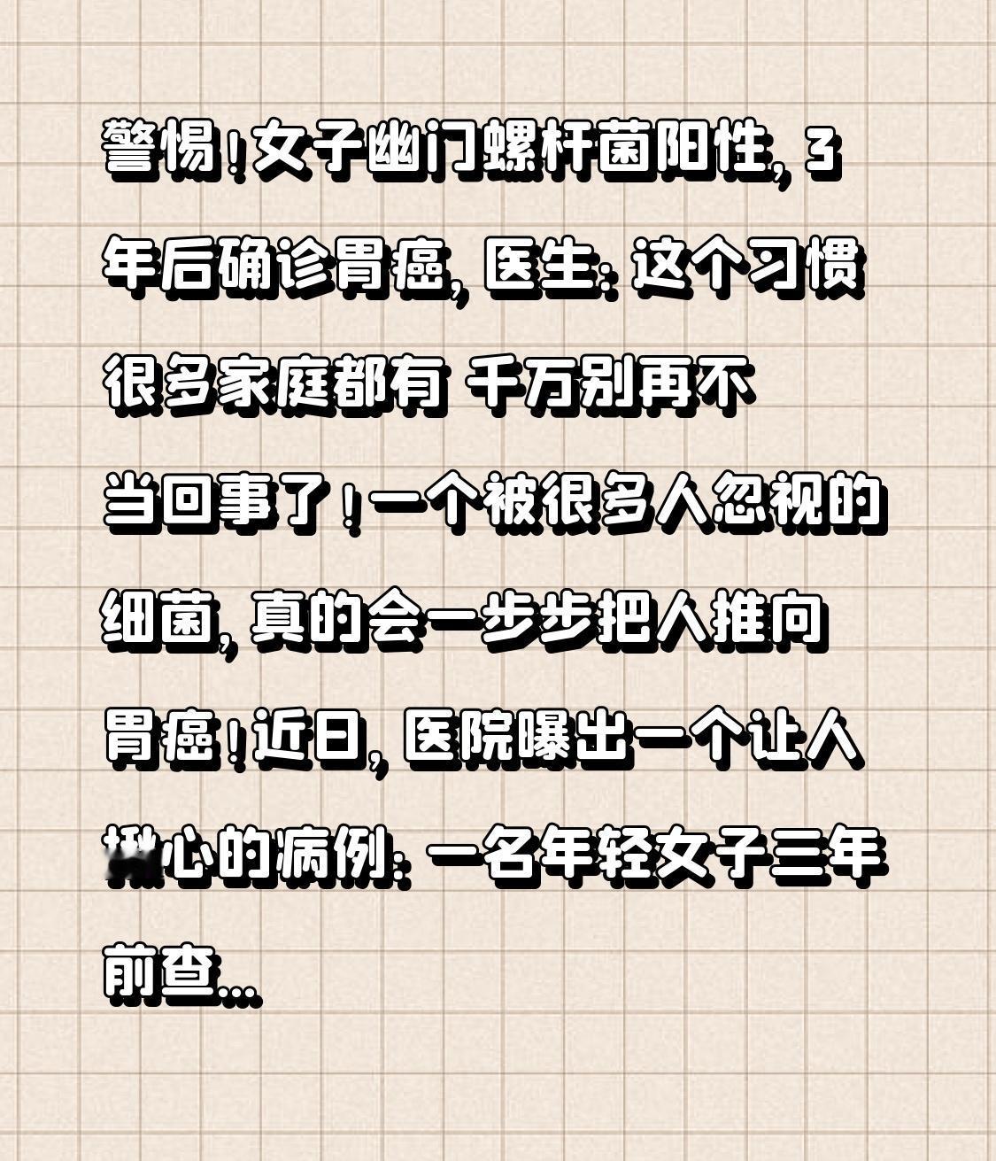 警惕!女子幽门螺杆菌阳性,3年后确诊胃癌,医生:这个习惯很多家庭都有 千万别再不当回事了!一个被很多人忽视的细菌,真的会一步步把人推向胃癌!近日,医院曝出一个让人揪心的病例:一名年轻女子三年前查出幽门螺杆菌阳性,觉得不痛不痒、没当回事,既不治疗也不复查,结果仅仅三年时间,直接确诊胃癌,追悔莫及! 视频一出,全网家长、上班族彻底慌了。很多人觉得:幽门螺杆菌不是很常见吗?吃点饭就好了,或者根本不用管,忍一忍就过去了。甚至有人说:十个人里九个有,根本不算病! 就在大家都抱着侥幸心理的时候,转折点来了! 医生直接发出严厉警告:幽门螺杆菌是一级致癌物,是胃癌的明确元凶,根本不是小毛病! 这名女子一开始只是轻微感染,因为平时经常在外吃饭、家里也没有分餐习惯,加上自己长期熬夜、吃外卖、饮食不规律,导致细菌在胃里疯狂繁殖,从胃炎→萎缩性胃炎→肠化生→癌变,短短三年,一步一步毁掉了一个健康的胃。 更可怕的是,幽门螺杆菌传染性极强,共用餐具、水杯、夹菜、口对口喂饭,甚至接吻,都能传染!一家人一起吃饭,一个人阳性,全家都可能被感染,这就是典型的“家庭癌”“餐桌癌”。 医生反复强调: 只要查出阳性,不管有没有症状,一定要正规治疗! 不要拖、不要扛、不要信偏方! 早查、早杀、早治,几十块钱的吹气检查,就能避免几十万都救不回来的悲剧。 看完这个病例,真的头皮发麻。我们总觉得疾病离自己很远,可危险就藏在一日三餐里。胃不好,苦一生;幽门螺杆菌不除,险一生。 别让疏忽变成遗憾,别让拖延换来绝望。提醒自己,也提醒家人: 好好吃饭,定期检查,分餐制,用公筷,守护好自己和最爱的人的胃。 健康最贵,平安最好。觉得提醒有用的,点赞转发,让更多人远离幽门螺杆菌,远离胃癌!