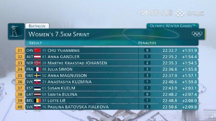 褚源蒙冬季两项女子短距离第31孟繁棋冬季两项女子短距离第48