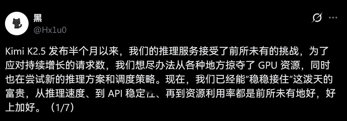 Kimi员工“黑”谈他们是如何优化推理性能的。还有提示玩小龙虾的朋友尽可能避免把 cronjob 设置在整点来避免高峰期响应能力下降。---------------------------Kimi K2.5 发布半个月以来,我们的推理服务接受了前所未有的挑战,为了应对持续增长的请求数,我们想尽办法从各种地方掠夺了 GPU 资源,同时也在尝试新的推理方案和调度策略。现在,我们已经能“稳稳接住”这泼天的富贵,从推理速度、到 API 稳定性、再到资源利用率都是前所未有地好,好上加好。