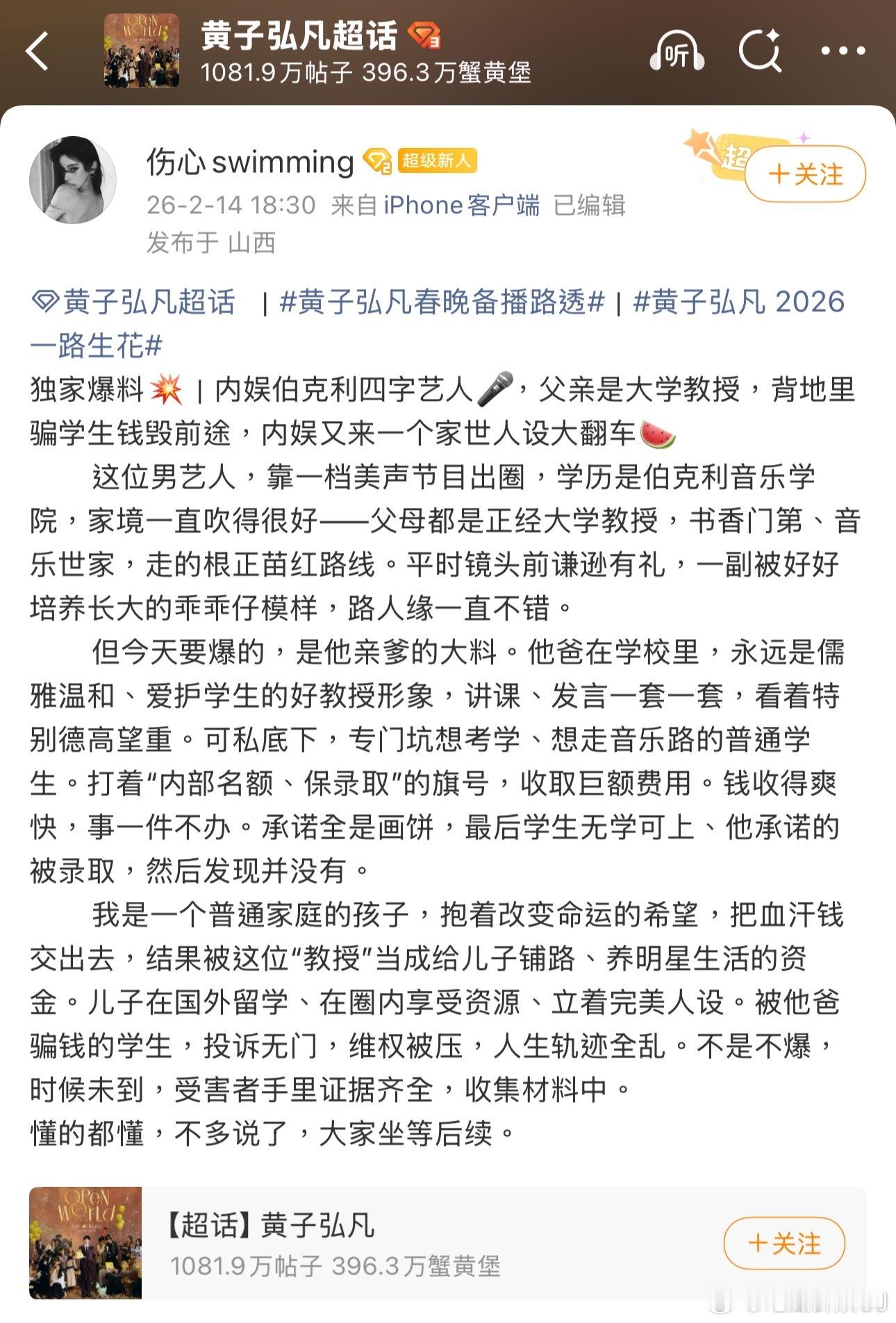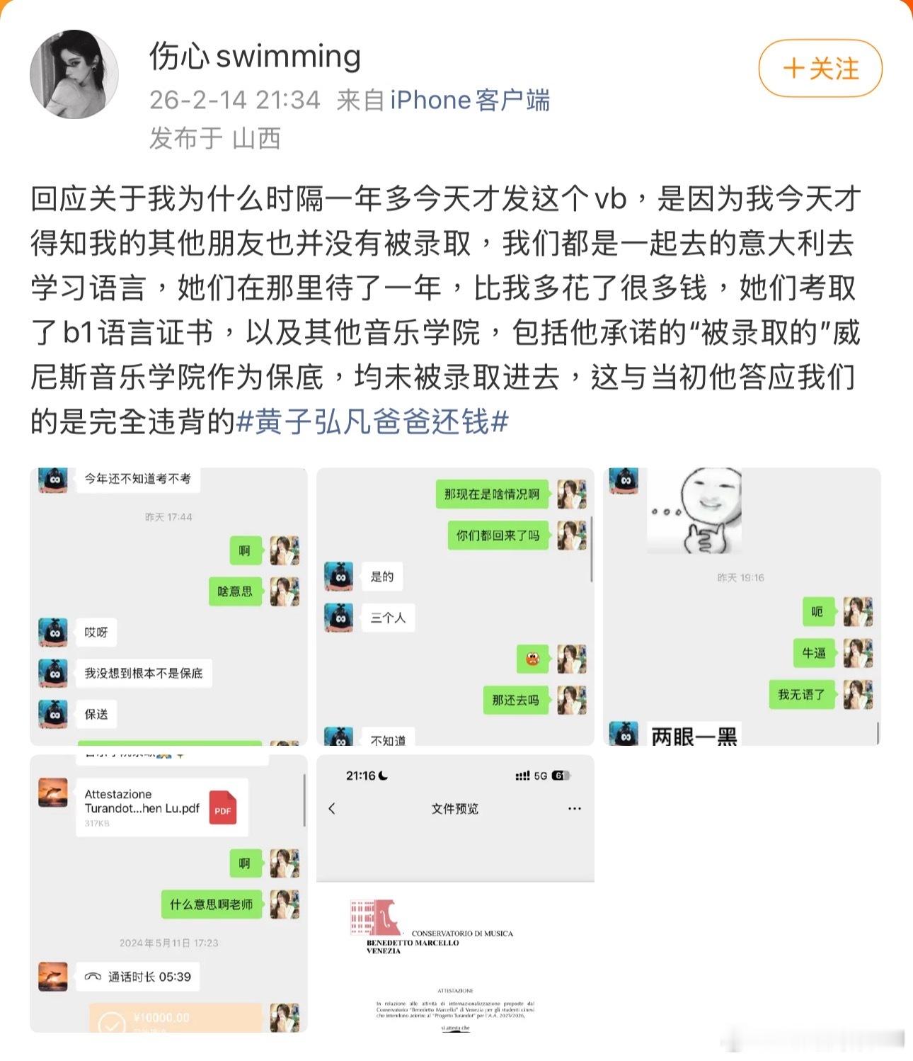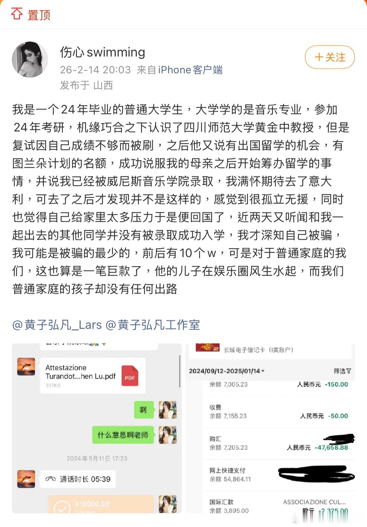 2月14日晚,有位叫伤心swimming的网友爆料,说自己2024年在备考音乐专业研究生阶段机缘巧合认识了四川师范大学教授、歌手黄子弘凡爸爸黄金中。该网友在复试被刷的前提下,相信了黄教授“可以走图兰朵计划出国留学”的说法,前后打点了10万元人民币后,对方表示她已经被威尼斯音乐学院录取,可等该网友实际去了意大利才发现事情并非如此。打听下她发现还有不少人也没被录取成功入学,深感被骗,所以要带上黄子弘凡的大名求个公道。
