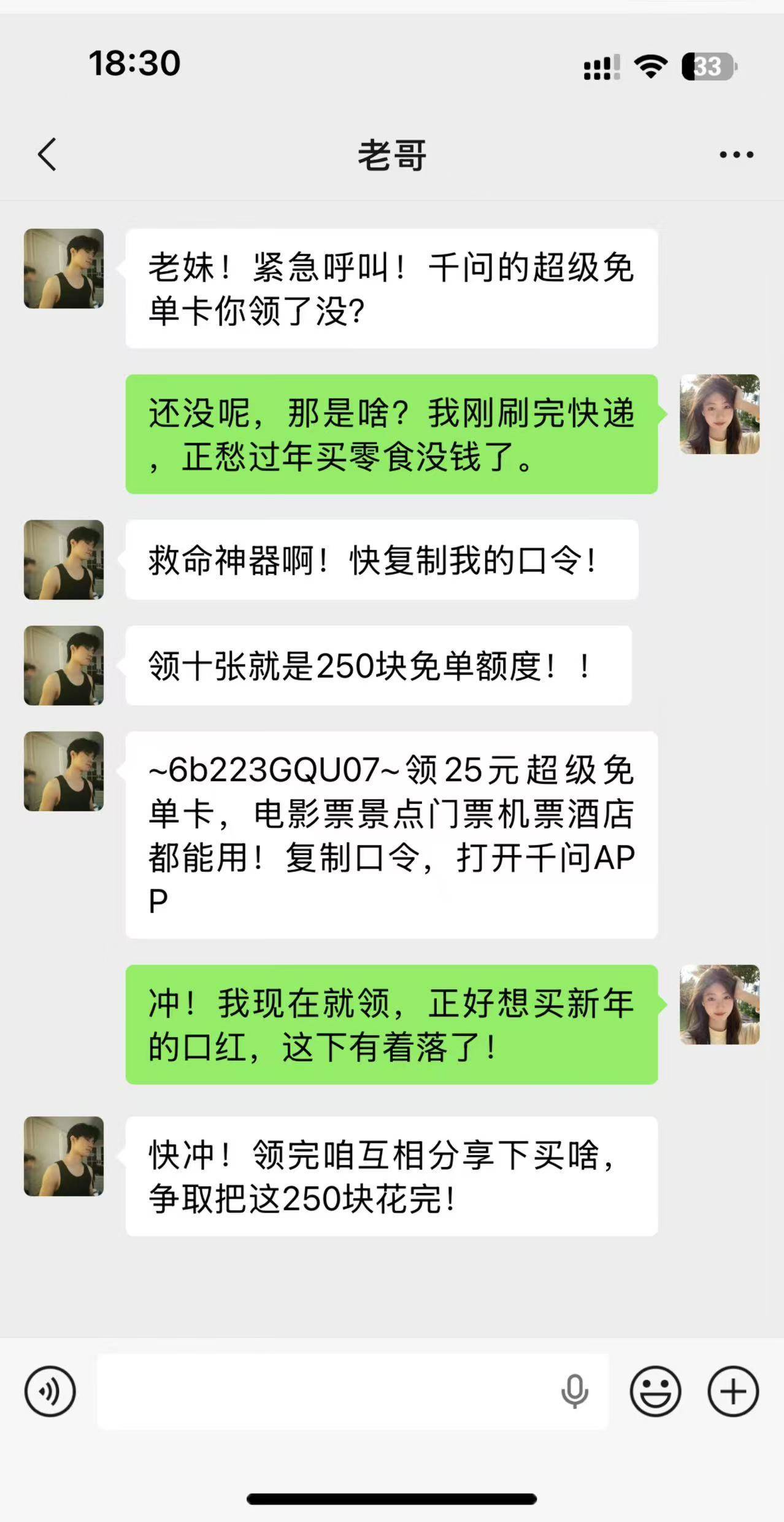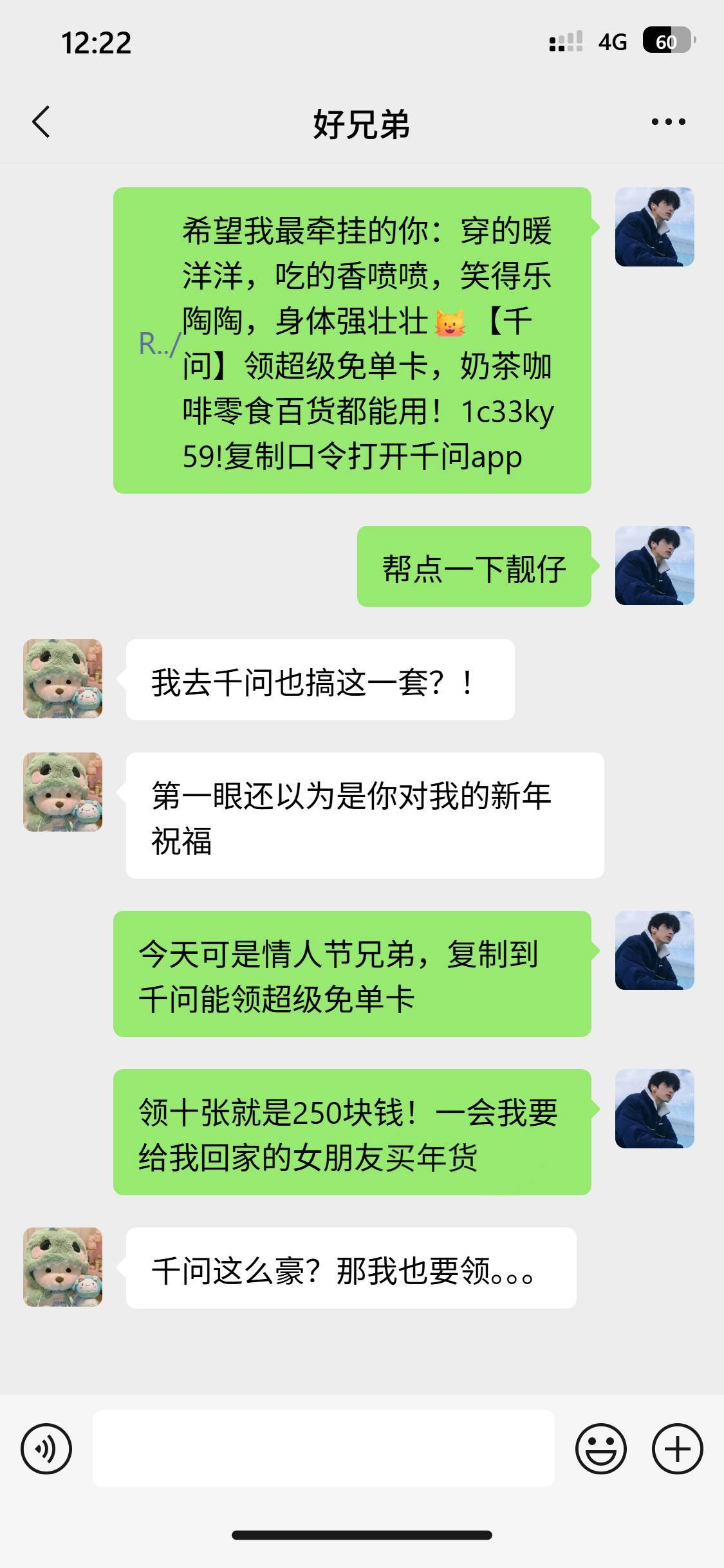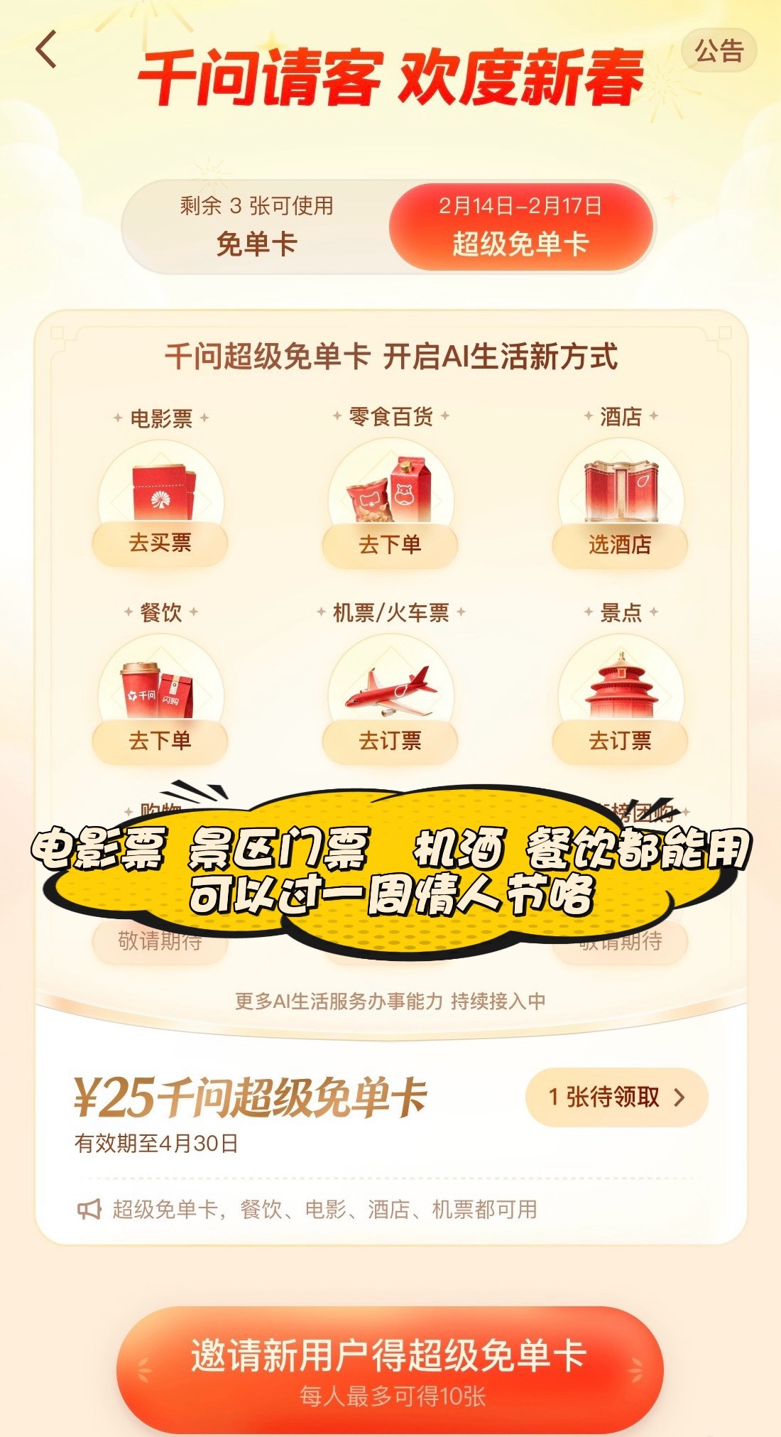 救命!情人节发现男朋友联系高中女同学 让我卷起来了!看到别人男友那么努力囤卡,我立刻结果他反手甩出一个战绩:“已囤满11张,请领导指示先宠幸哪张?” 并附上了电影、酒店、门票的备选清单…好的,这场“超级免单卡”杯恩爱大赛,我单方面宣布我们赢了!千问超级免单卡能买年货能买票千问超级免单卡再加3天