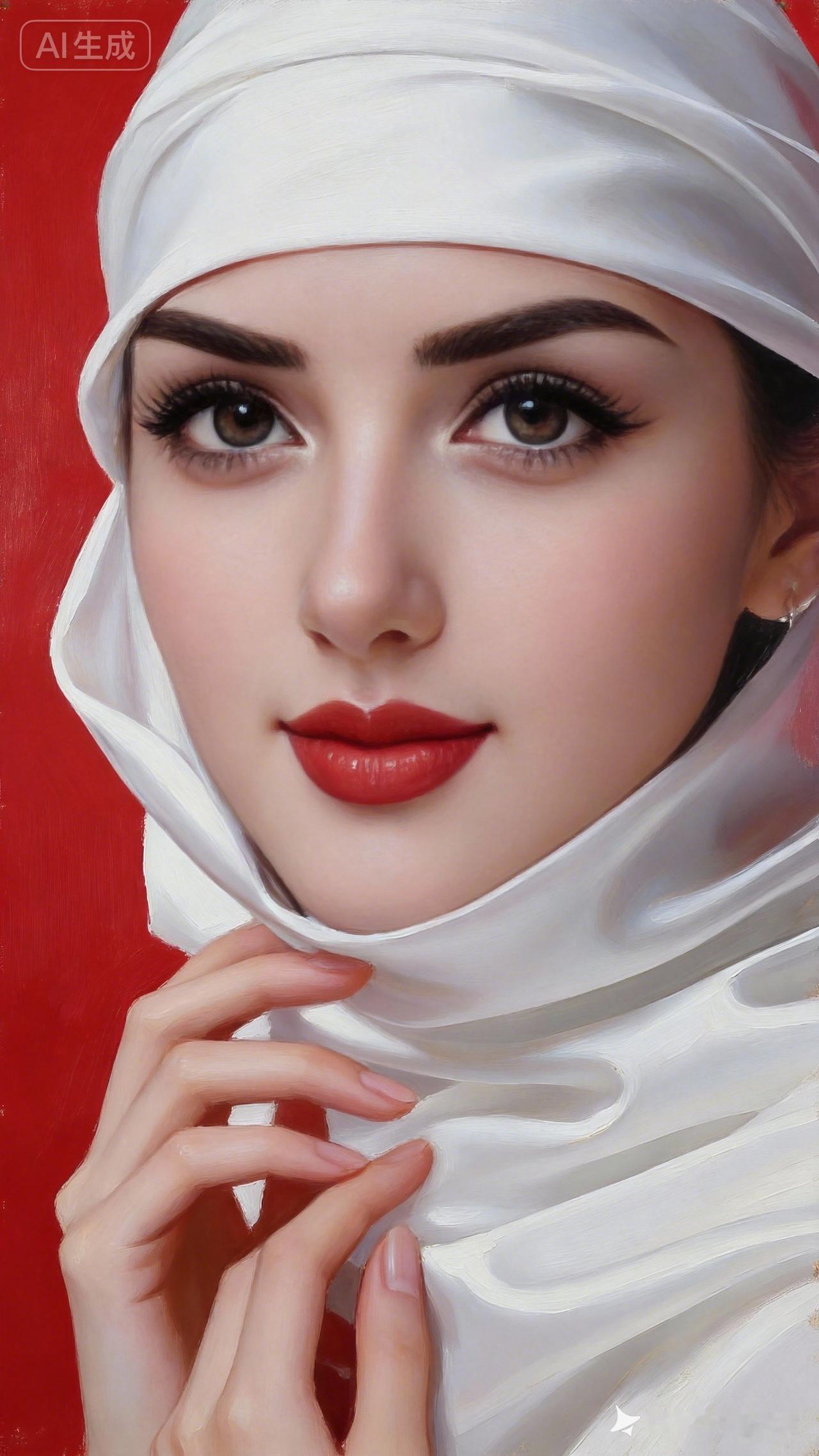 半身特写,美女五官精致雕琢,妆容无瑕肌肤胜雪。身着白色丝绸服饰,光泽柔润细腻,层次丰富。古典美学与数字渲染相融,大师级质感。
