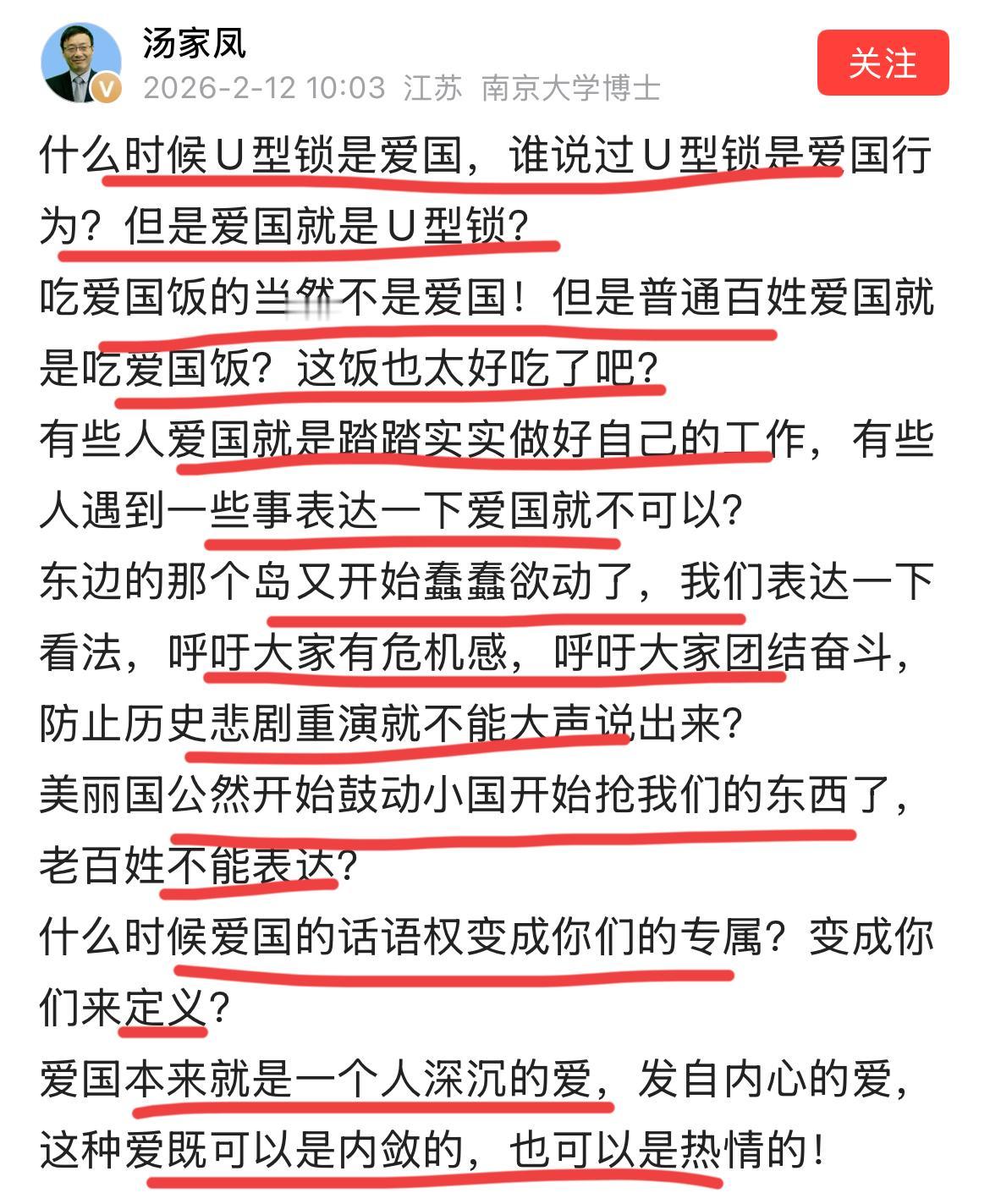 南京大学博士汤家凤怒批妖魔化爱国的人! 他表示,表达一下爱国,是老百姓的朴素情怀,怎么就变成U型锁了?爱国就是吃的爱国饭,这饭也太好吃了吧!! 表达一下最朴素的情感,有何问题? 小日子在东边蠢蠢欲动,你还没看到吗? 这是呼吁大家重视,和平时期,也要有危机感,大家团结一致,才能避免悲剧的再次发生,这又有什么问题呢? 还不仅仅于此,美帝已经公然开始抢东西了,你们还蒙在鼓里,不让老百姓发声,表达么?爱国,可以是深沉的,内敛的,也可以是热情的,奔放的,方式可以不拘一格,只要是真实的情感表达即可!! 爱国什么时候变U型锁了,谁干的,忒坏了点,这分明是妖魔化爱国,污名化爱国嘛,对此,你有什么想说的呢??