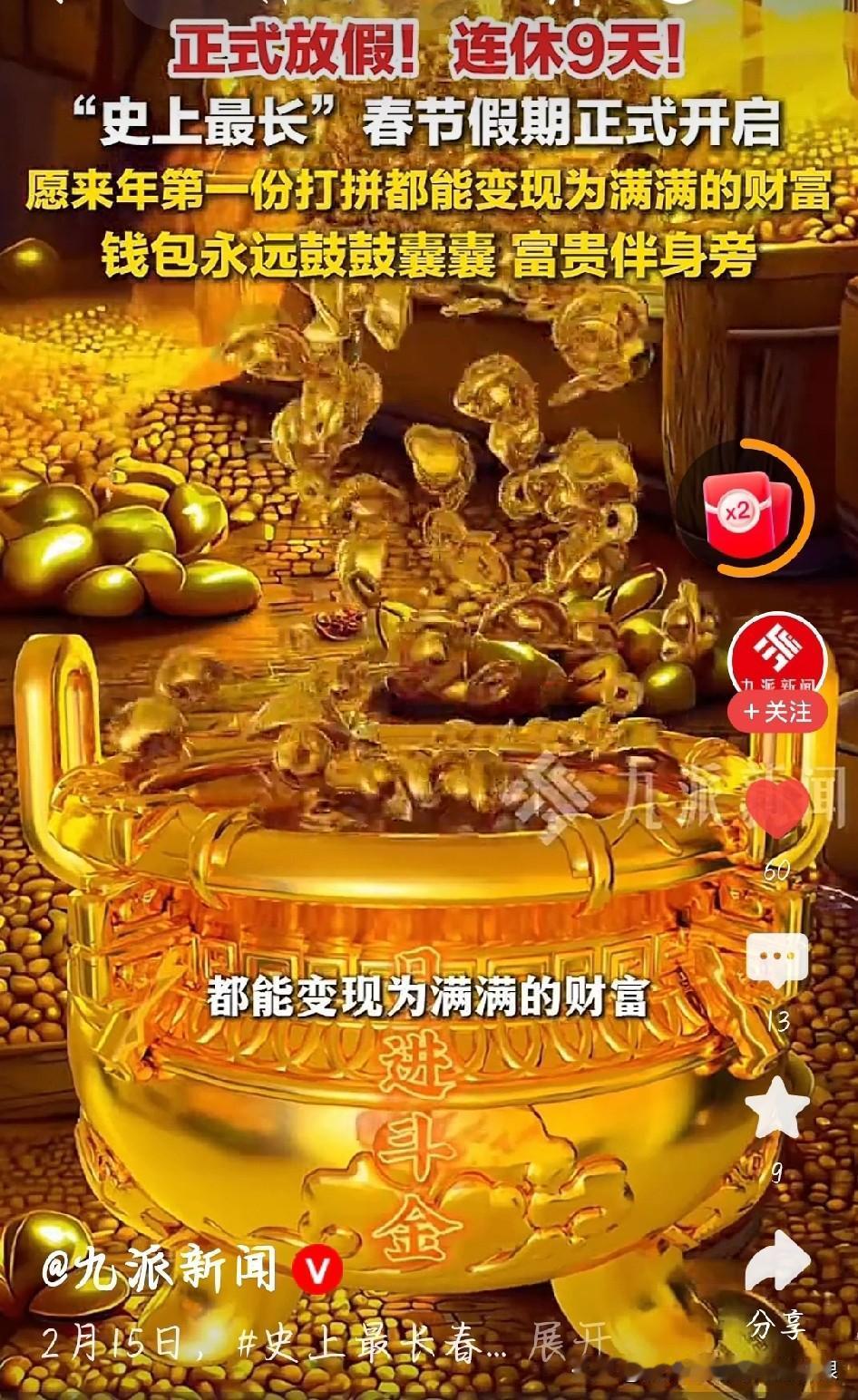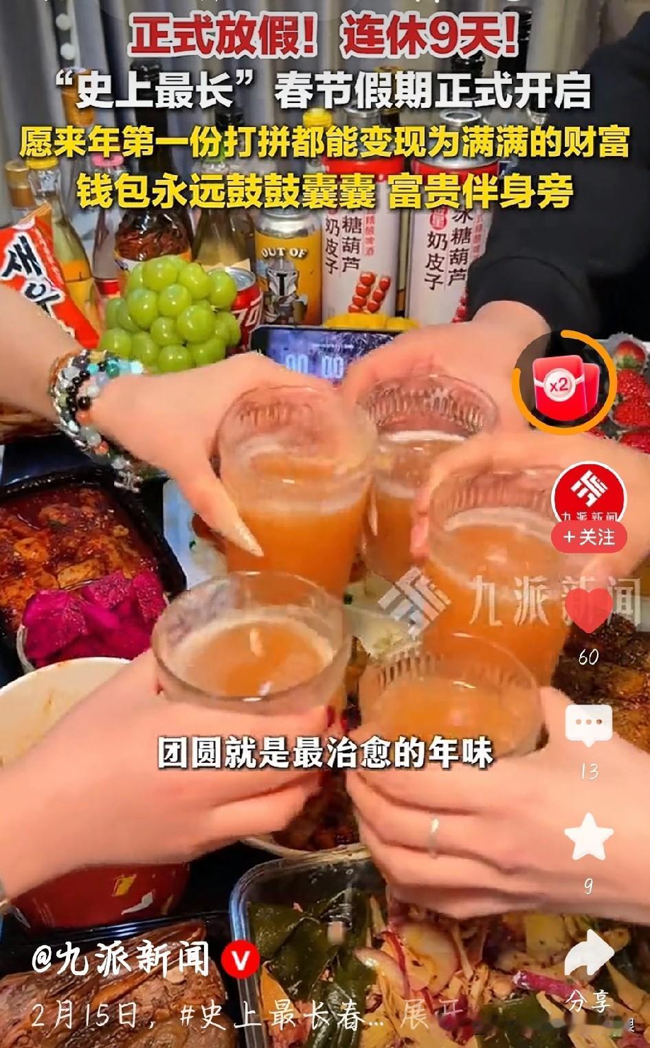 史上最长春节假,正式开始! 不用调闹钟,不用赶早高峰,史上最长9天春节假期,今天正式开启! 从腊月二十八放到正月初七,整整9天。高速免费9天,想回家的、想出游的,尽管安排。 唯一要记的是:2月14日和28日要补班。但那是后话,眼下只负责开心。 把工作群静音,把烦恼清空。好好陪爸妈,好好吃团圆饭,把这一年的辛苦都补回来! 史上最长春节假期正式开启 图片截图于网络