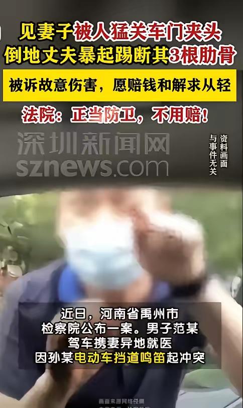 这起河南禹州的案件非常典型地反映了正当防卫的法律适用,也体现了司法机关对具体案情的审慎判断。 案件核心事实: 范某驾车紧急送病危妻子去医院,急需通行。 电动车主孙某故意挡道并拒绝让行,造成阻碍。 范某下车沟通时被孙某拉扯摔伤,但并未还手。 妻子探出头查看情况时,孙某猛然关车门,夹伤其头部。 范某见状,本能踢踹孙某,导致其肋骨骨折。 孙某起诉范某故意伤害并索赔15万元。 公安机关立案,范某愿意赔偿并请求从轻处罚。 检察机关通过监控审查,认定范某的行为属于阻止正在进行的侵害,符合正当防卫。 最终不起诉,范某无罪,孙某的赔偿要求失败。 司法机关的判决逻辑: 正当防卫的成立条件在于存在正在进行的不法侵害行为,且防卫行为必须是为了阻止该侵害,且不过度。 在案中,孙某持续用车门夹头,显然对范某妻子造成严重人身伤害。 范某踢踹孙某时,其侵害行为尚在继续,是阻止侵害行为的本能反应。 防卫行为虽造成伤害,但没有明显超过必要限度。 因此,范某防卫行为法律上被认可为正当防卫。 社会影响与启示: 此案提醒公众:遇到恶意阻挠他人紧急救助,不能简单以“双方都有责任”划等号。 法律的防卫权是真实有效的,公民在面对明显且正在进行的侵害时,有权采取必要防卫措施保护自己及他人。 司法机关强调审查事实和情境,不片面偏袒任何一方,依法保障防卫权得以实现。 该案也引发公众对社会公德与责任的反思,尤其是交通文明和紧急救护通道的保障。 如果你需要进一步了解相关法律条文或类似案例分析,我可以帮你详细解答。正当防卫 刑法的正当防卫