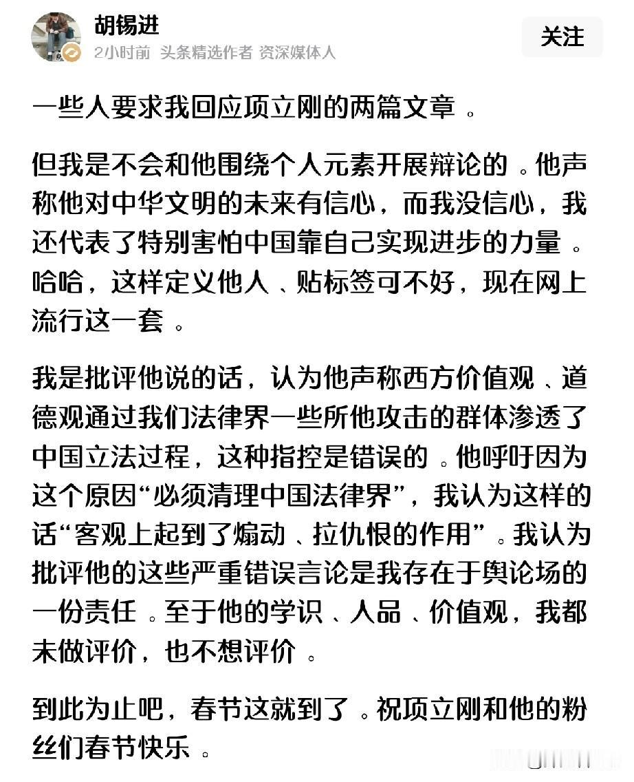 胡锡进 发文回应 项大郎→不想评价 “这样定义他人、贴标签可不好”、“客观上起到了煽动、拉仇恨的作用” 用一句“到此为止,新春快乐”避战止战 避开了无休止的网络骂战,也保留了体面... 项大郎不愧是高手,前段时候连续5篇《失败者论》怼得老罗哑口无言。 近日,又连载两篇文章怼胡,把胡怼得只能“到此为止吧,祝项大郎和他的粉丝春节快乐”。 只不过胡没有回应,胡说“我是不会和他围绕个人元素开展辩论的”。 胡与项这事,无论谁是谁非,就凭胡的这个态度,个人感觉就挺好,没有必要,网络平台不是辩论平台。 正如前段时间贾国龙和罗永浩的事件,V博CEO「来去之间」所说的那样 “想论战,应该还是需要通过媒体采访的方式来进行”。